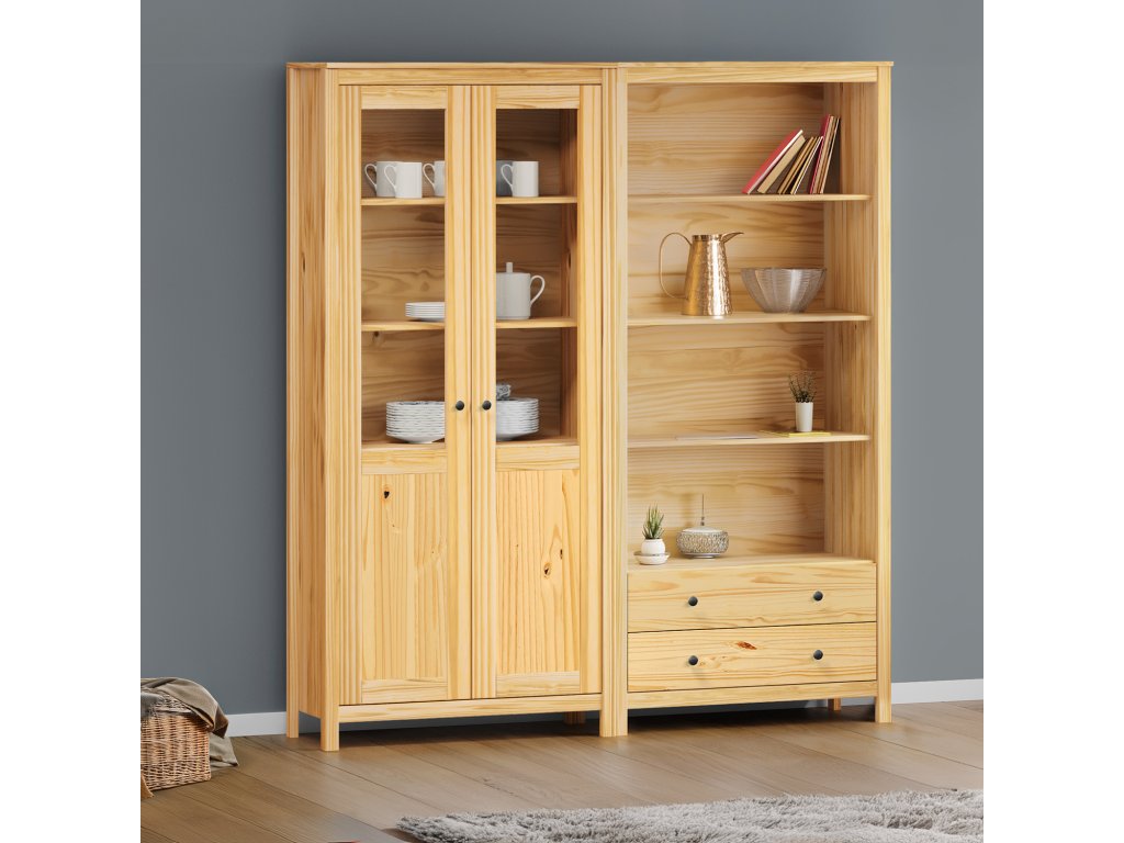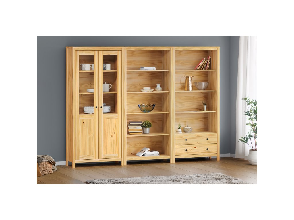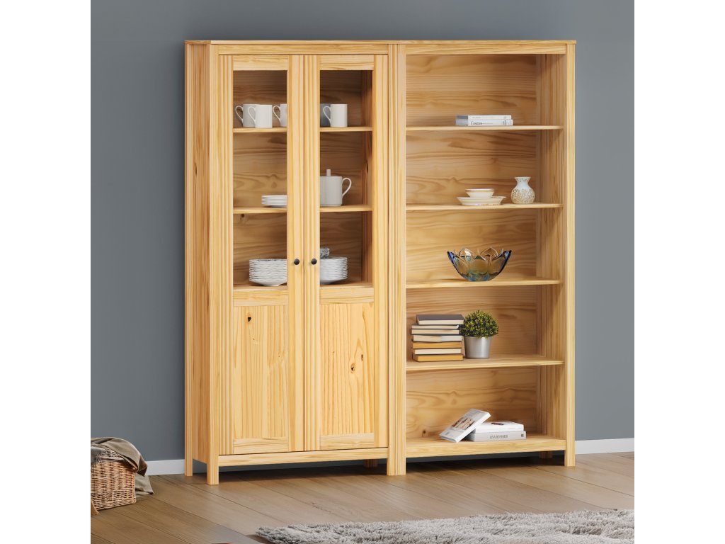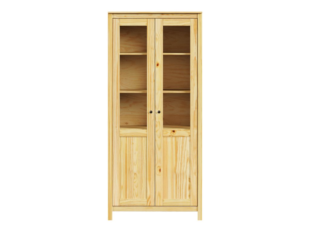 Vitrína je vyrobena z masivní borovice s lakovaným povrchem, což zajišťuje odolnost a snadnou údržbu.