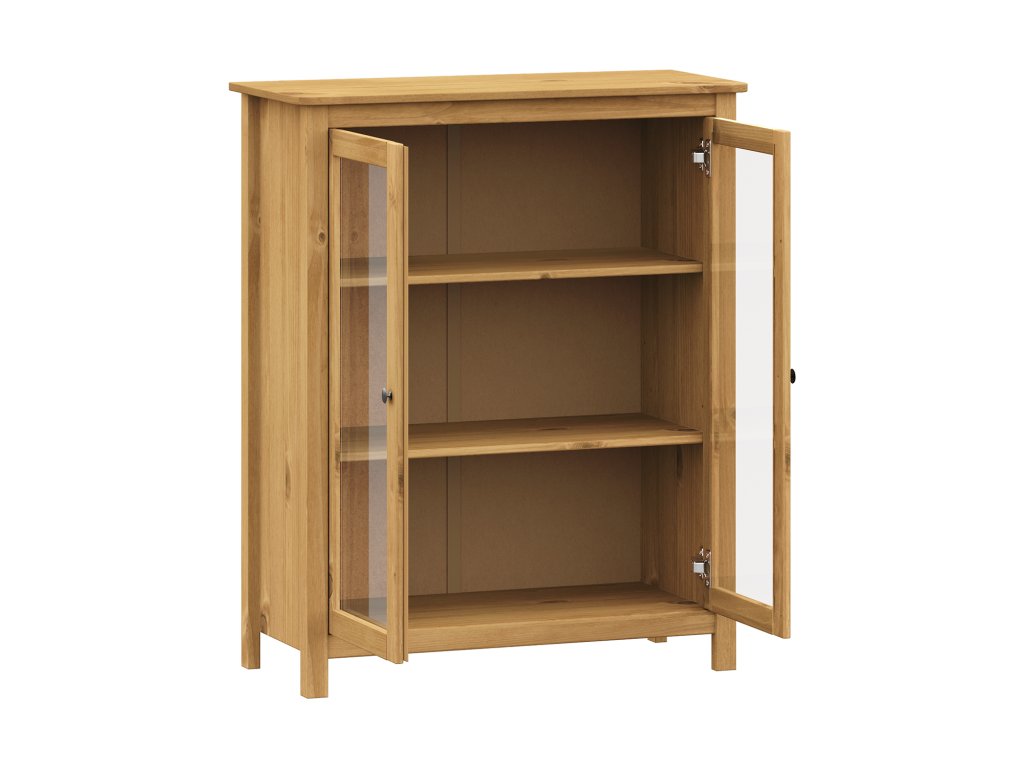 materiál masiv borovice voskovaná v medovém odstínu kovové úchytky v barevném provedení černěná mosaz 2 prosklené dveře, 2 police maximální nosnosti uvedeny v návodu k montážiDoplňkové parametry