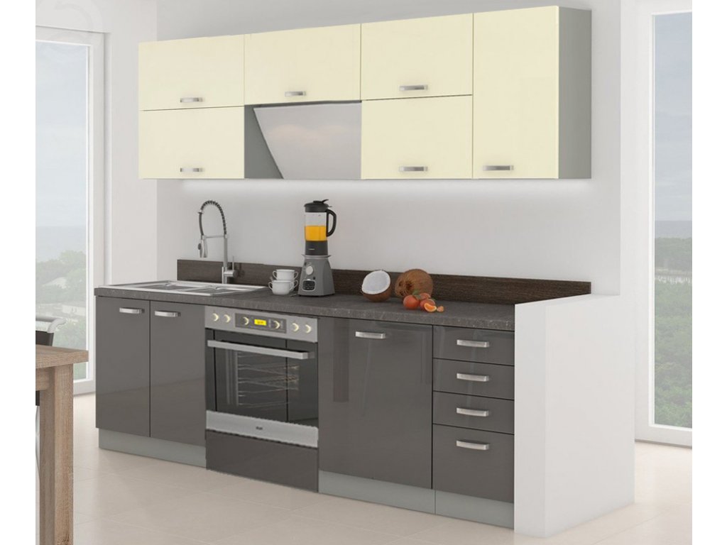Korpus a sokl v šedé barvě doplňují lesklá MDF dvířka v kombinaci šedé a krémové, což vytváří elegantní a nadčasový vzhled vhodný do různých interiérů.