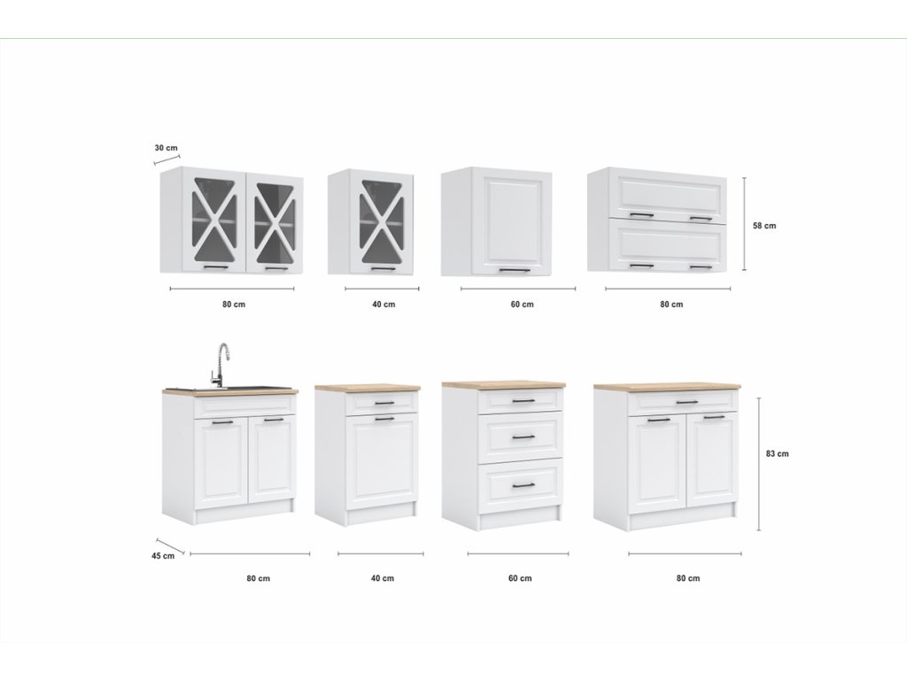 Kuchyňská linka Tyra je vyrobená ve velmi oblíbeném skandinávském stylu, který se hodí do kuchyně v paneláku i v rodinném domě. Tento styl má jedinečnou schopnost proměnit Vaši kuchyň v útulnou a zároveň funkční místnost, kde bude radost vařit i péct. Kuchyňská linka Tyra nabízí dostatek úložného i pracovního prostoru. Všechny skříňky jsou samostatné, takže si je můžete sestavit tak, jak Vám to vyhovuje. Korpusy skříněk jsou vyrobené z lamina 18 mm s hranami ABS a dvířka jsou MDF 16mm. Všechny skříňky jsou dodávány v demontu. Součástí balení je montážní plánek včetně všech potřebných spojovacích materiálů. Cena je uvedena za sestavu vyobrazenou na úvodní fotografii BEZ PRACOVNÍ DESKY, s úchytkami, které jsou vyobrazeny v doplňkových fotografiích. Pracovní desku lze dokoupit nad každou skříňku zvlášť podle její šíře. Vyobrazené spotřebiče, dřez, baterie, doplňky a dekorace nejsou v ceně.