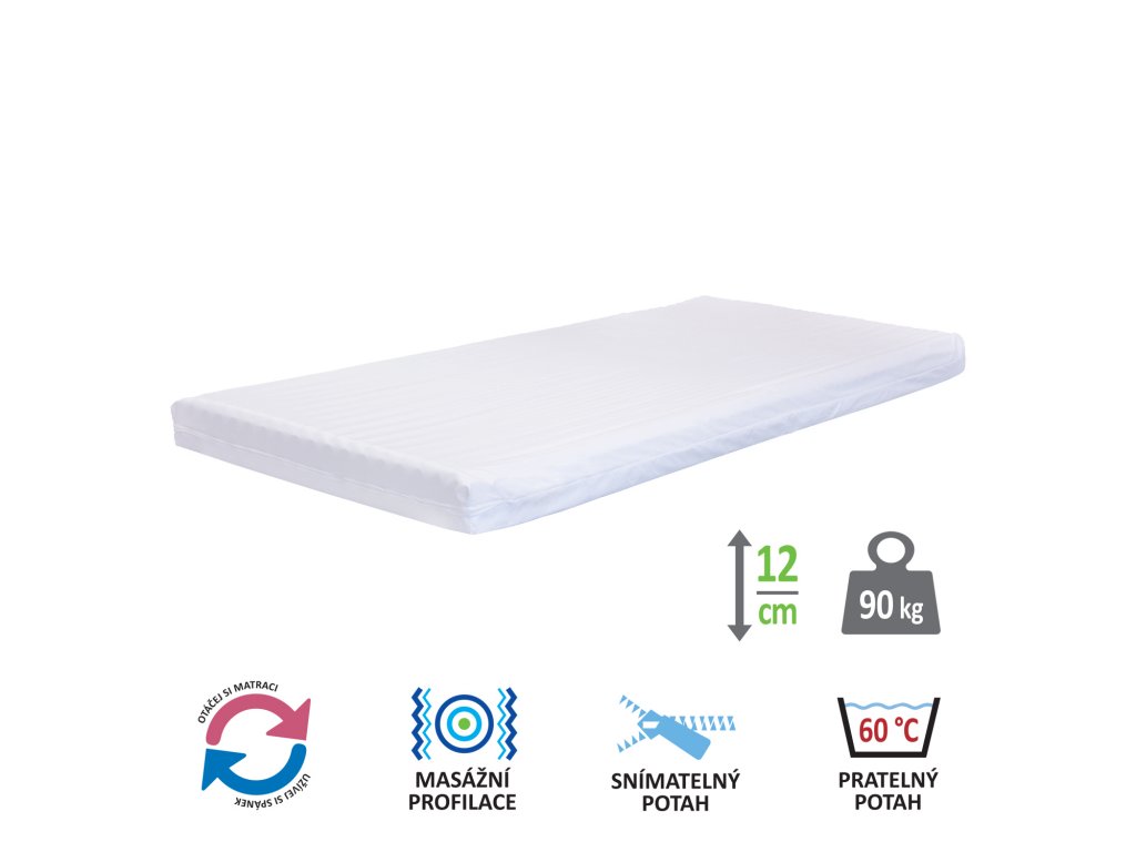 Doporučená nosnost matrace je do 90 kg, což odpovídá běžným požadavkům na jednolůžka.