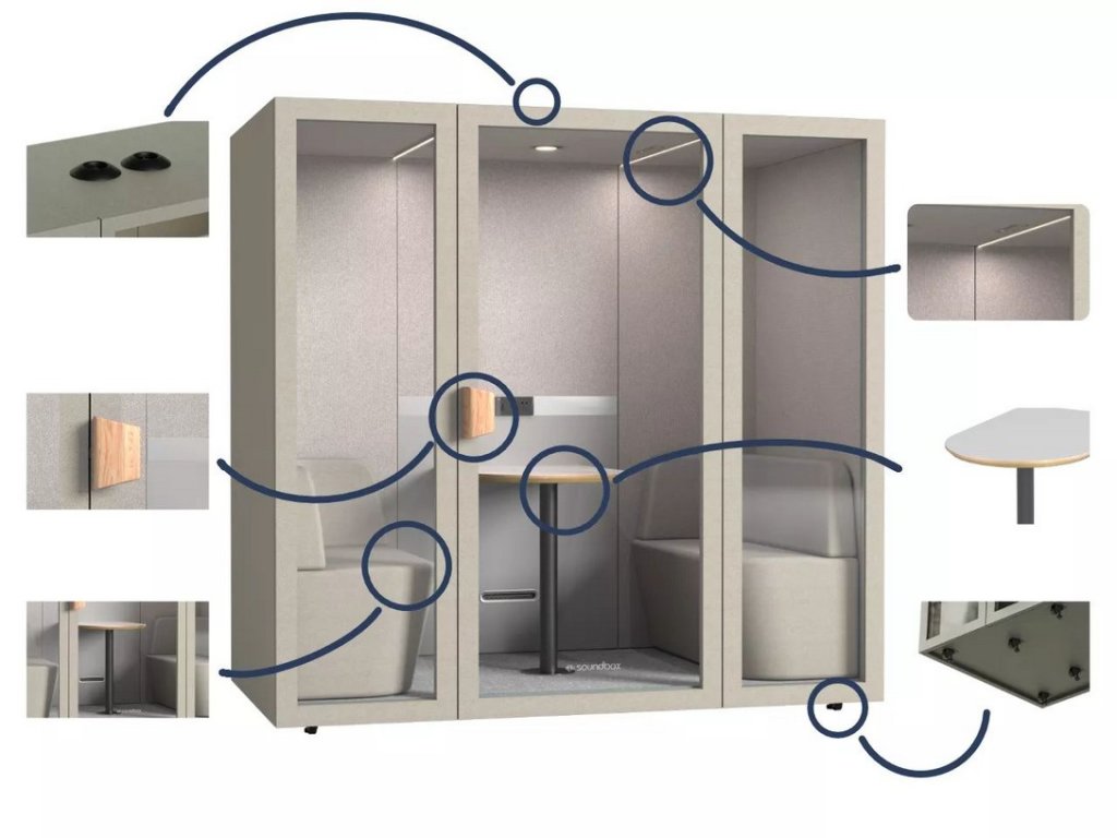 Kabina je vybavena prosklenými dveřmi, LED osvětlením, ventilačním systémem a elektrickými zásuvkami. Konstrukce je tvořena kombinací akustických materiálů určených ke snížení hluku. Díky skrytým kolečkům je kabina mobilní.