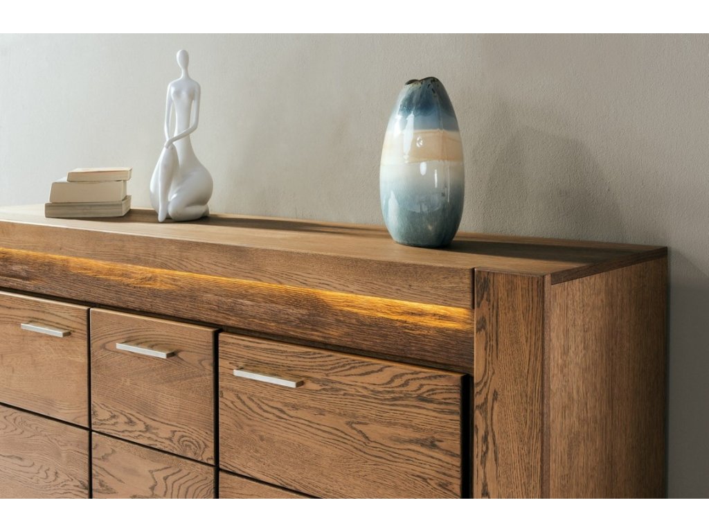 Šatní skříň se zrcadlem. Skříň má 3 dveře. Vsazením osvětlení do ozdobné rýhované lišty, které je v ceně, je zvýrazněn rustikální vzhled masivního dřeva. Celá řada se vyznačuje elegancí a jednoduchými tvary, které zaručují plné využití prostoru. Nábytek je v barvě dub rustical, vyroben z kvalitního masivního dřeva, korpusy vnitřní jsou z lamina, korpusy vnější jsou z přírodní dýhy. Elegantní úchyty jsou z kovu. Dodáváme ve smontovaném stavu.Doplňkové parametry