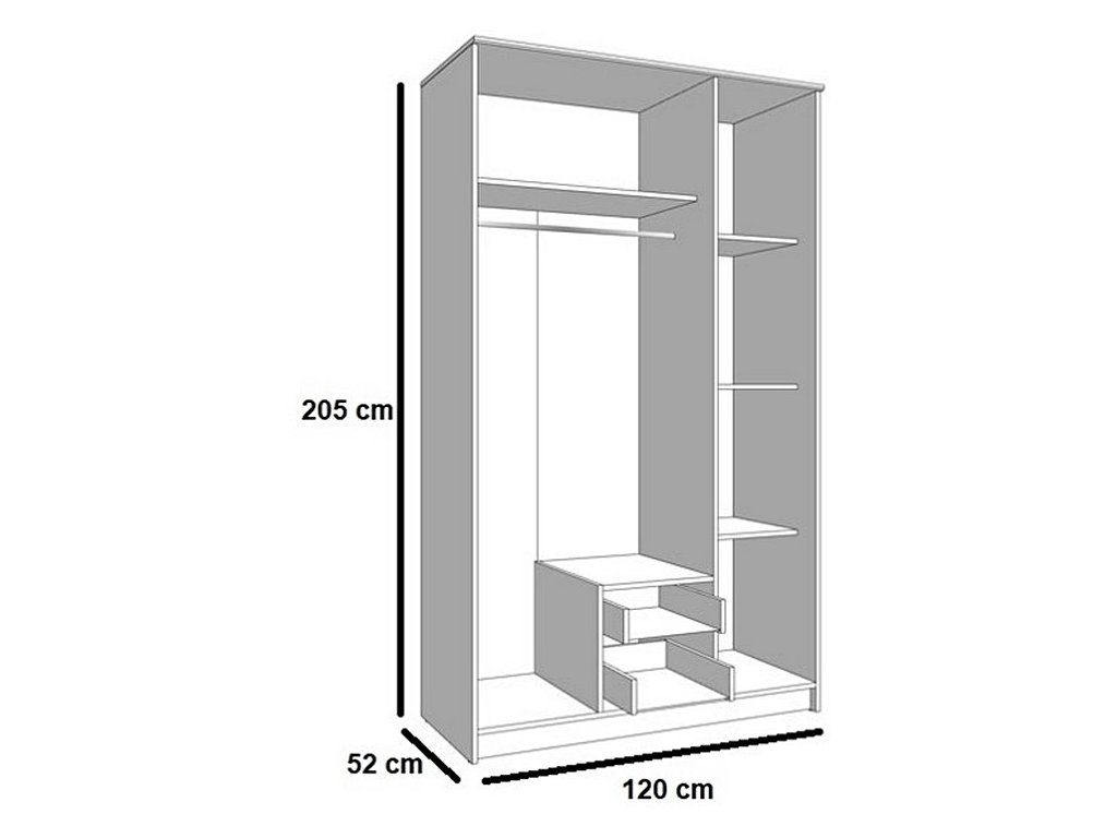 Jednoduchá šatní skříň se zrcadlem, která se díky svým rozměrům vejde i do malých prostorů. Korpus i dveře jsou z kvalitní LTD desky v barvě dub sonoma. Nezvyklá výška 205 cm nabídne opravdu dostatek prostoru. Vnitřní rozložení skříně nabízí na jedné straně police, na druhé straně šatní tyč a 2 šuplíky. Dodáváme v demontovaném stavu.Doplňkové parametry
