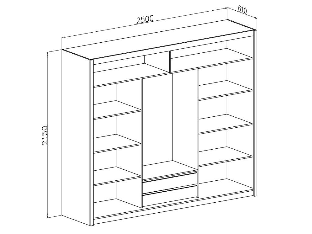 Šatní skříň s třemi posuvnými dveřmi v moderním provedení. Krajní části jsou policové, uprostřed je šatní tyč. Korpus je z kvalitního LTD v barvě dub canyon. Dveře jsou také v barvě dub canyon/bílá, uprostřed každých dveří je zrcadlo. Uspořádání polic viz. perokresba. Pojezdové lišty jsou hliníkové. Dodáváme v demontovaném stavu.Doplňkové parametry