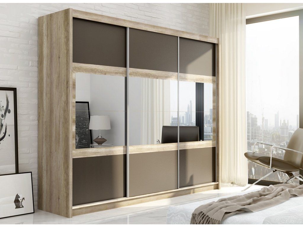 Šatní skříň s třemi posuvnými dveřmi v moderním provedení. Krajní části jsou policové, uprostřed je šatní tyč. Korpus je z kvalitního LTD v barvě dub canyon. Dveře jsou také v barvě dub canyon/láva, uprostřed každých dveří je zrcadlo. Uspořádání polic viz. perokresba. Pojezdové lišty jsou hliníkové. Dodáváme v demontovaném stavu.Doplňkové parametry