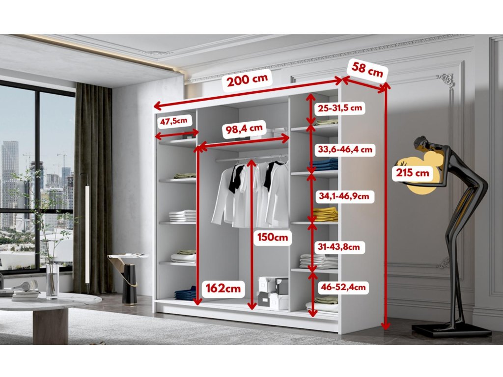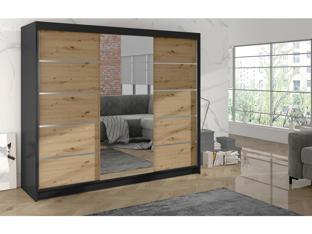 Šatní skříň Debora VI v moderním designu má šířku 200 cm a je rozdělena na tři praktické části. Posuvné dveře šetří místo a usnadňují přístup do interiéru. Vnitřní uspořádání kombinuje závěsnou tyč a devět polic, což umožňuje přehledné a praktické rozdělení šatníku.