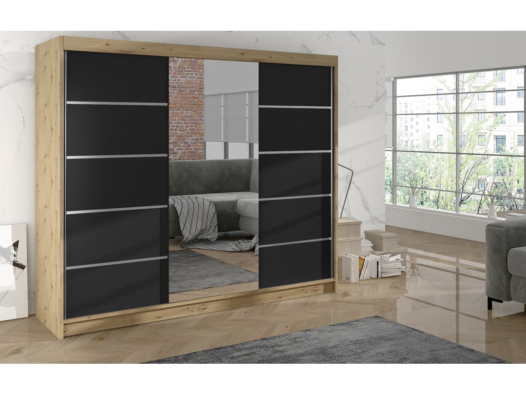 Šatní skříň Debora VI v moderním designu má šířku 200 cm a je rozdělena na tři praktické části. Posuvné dveře šetří místo a usnadňují přístup do interiéru. Vnitřní uspořádání kombinuje závěsnou tyč a devět polic, což umožňuje přehledné a praktické rozdělení šatníku.