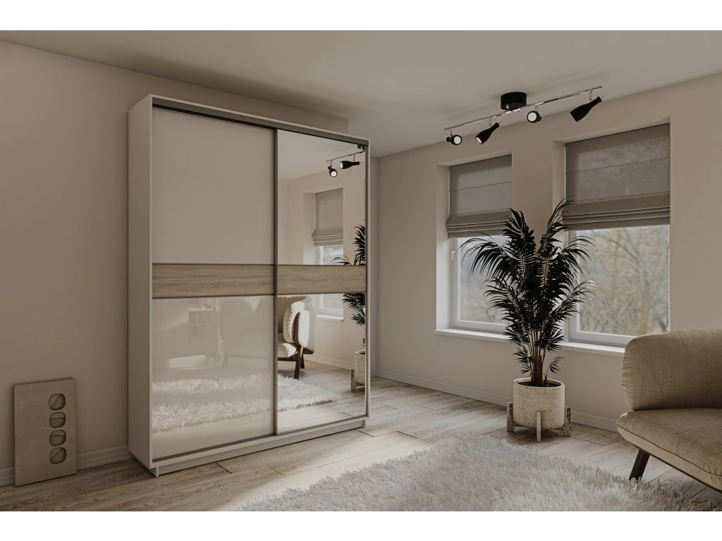 STEPHÁNÍ je dvoudveřová moderní šatní skříň, která je charakteristická praktickým úložným prostorem. Skříň disponuje posuvnými dveřmi. Je v barevném provedení bílá / dub Sonoma.