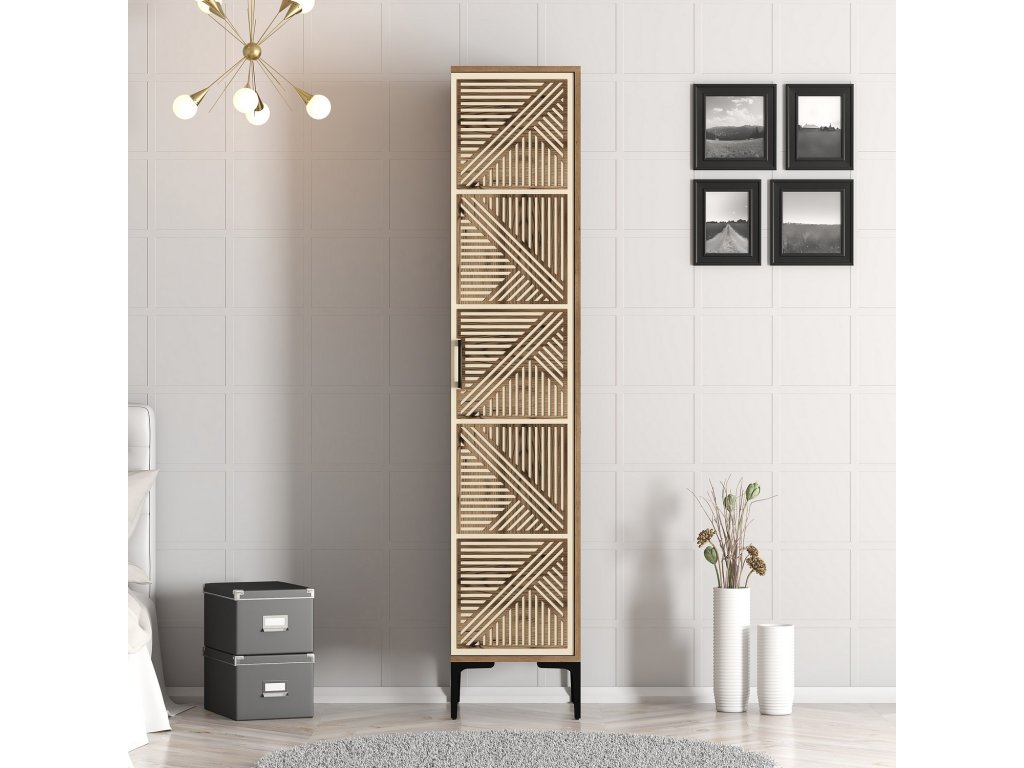 Vysoká policová skříň KUMSAL P nabízí dostatek místa pro uspořádání oblečení, doplňků i drobností. Ideální do ložnice nebo předsíně.
