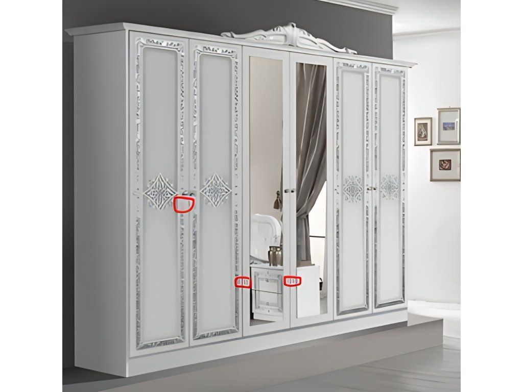 Šatní skříň šestidveřová v barokním stylu je vyrobena z desky LTD v barvě bílá se stříbrnými ornamenty a doplňky. Skříň je rozdělena do tří oddílů a v každém z nich je jedna police a šatní tyč. Prostřední část skříně je z čelní strany doplněna dvěma zrcadly. Dodáváme v demontovaném stavu.