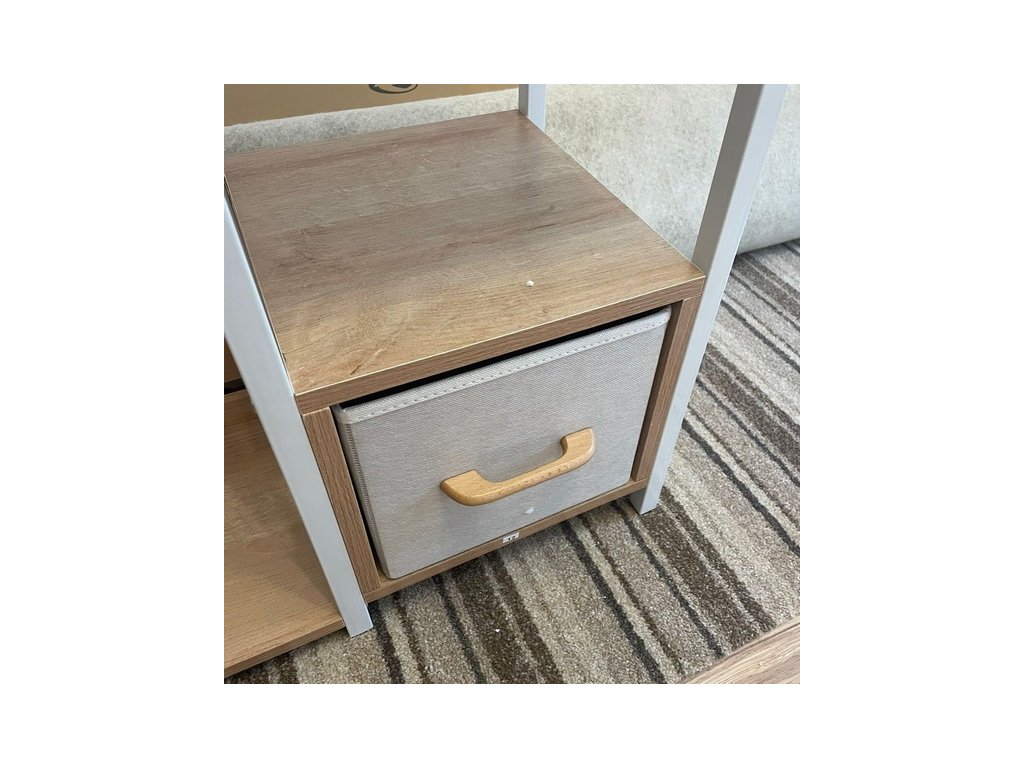 Konstrukce je vyrobena z MDF v kombinaci bílé a dub sonoma, kovové nohy zajišťují stabilitu. Vnitřek zásuvky je z pevné látky, která se dá složit, což usnadňuje údržbu.