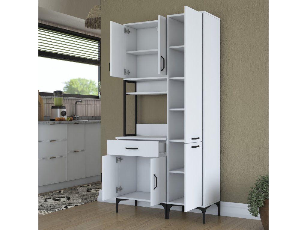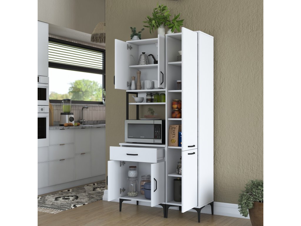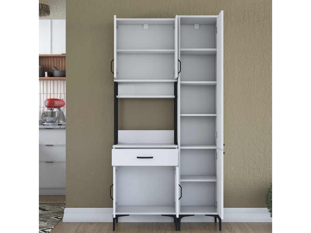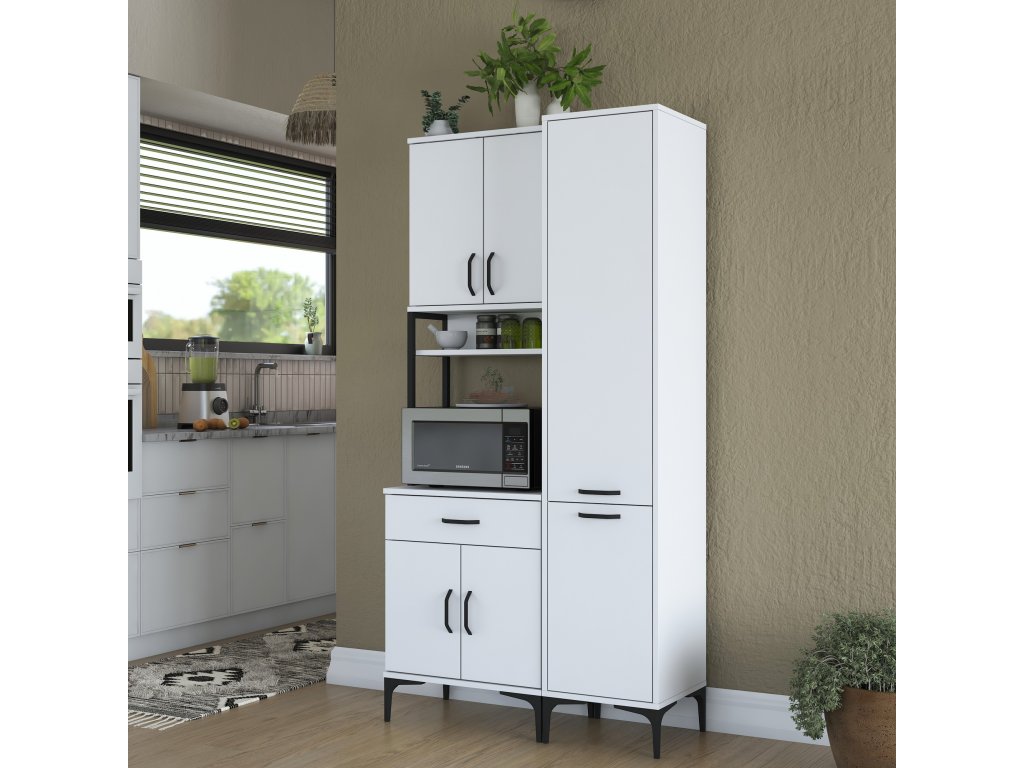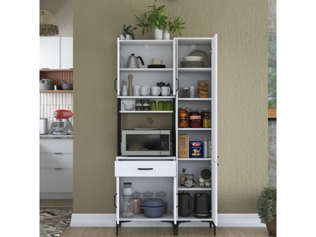 Skříň nabízí praktický úložný prostor, který zahrnuje pět plných dvířek, zásuvku a otevřený regálek. Tato víceúčelová skříň je navržena tak, aby pojala mikrovlnnou troubu, kuchyňské spotřebiče i další předměty, které chcete mít po ruce.