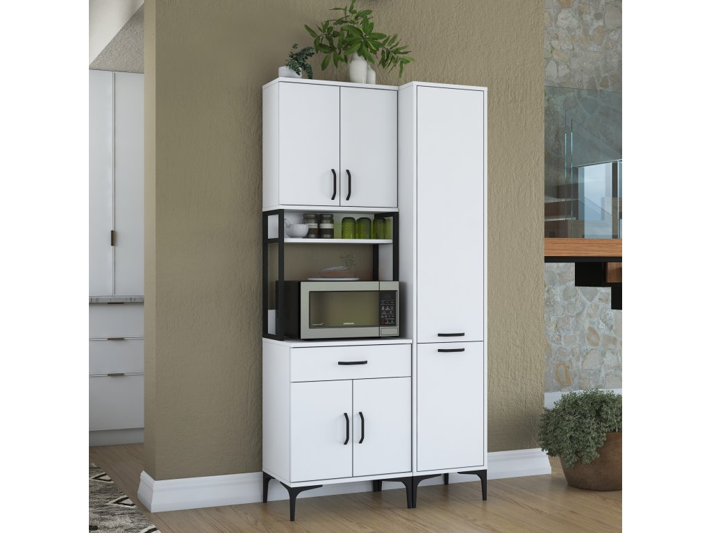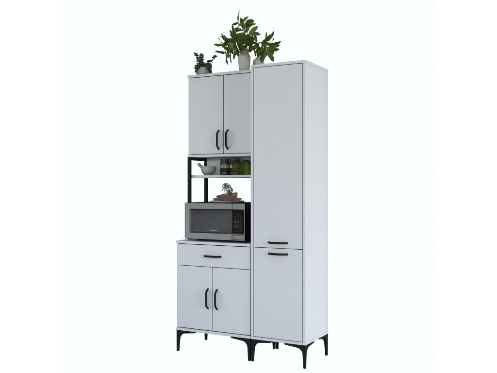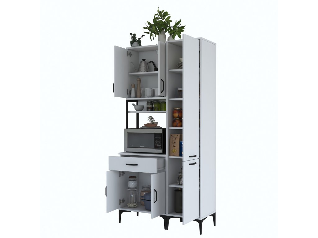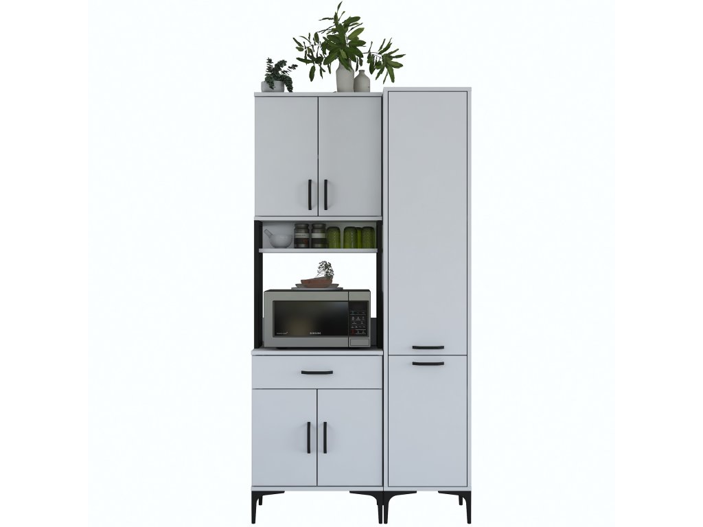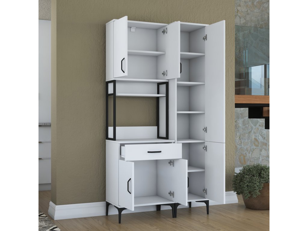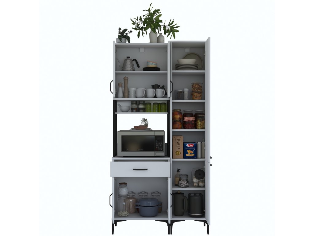 Skříň nabízí praktický úložný prostor, který zahrnuje pět plných dvířek, zásuvku a otevřený regálek. Tato víceúčelová skříň je navržena tak, aby pojala mikrovlnnou troubu, kuchyňské spotřebiče i další předměty, které chcete mít po ruce.