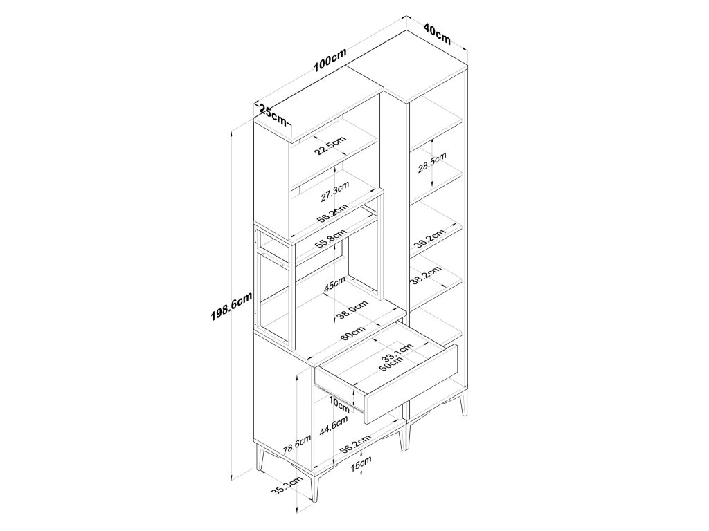Skříň má rozměry přibližně 198,6 cm na výšku, 100 cm na šířku a 40 cm na hloubku, což je ideální pro menší kuchyně.