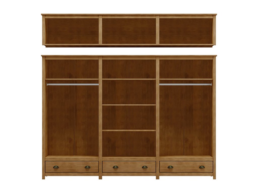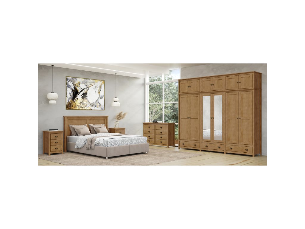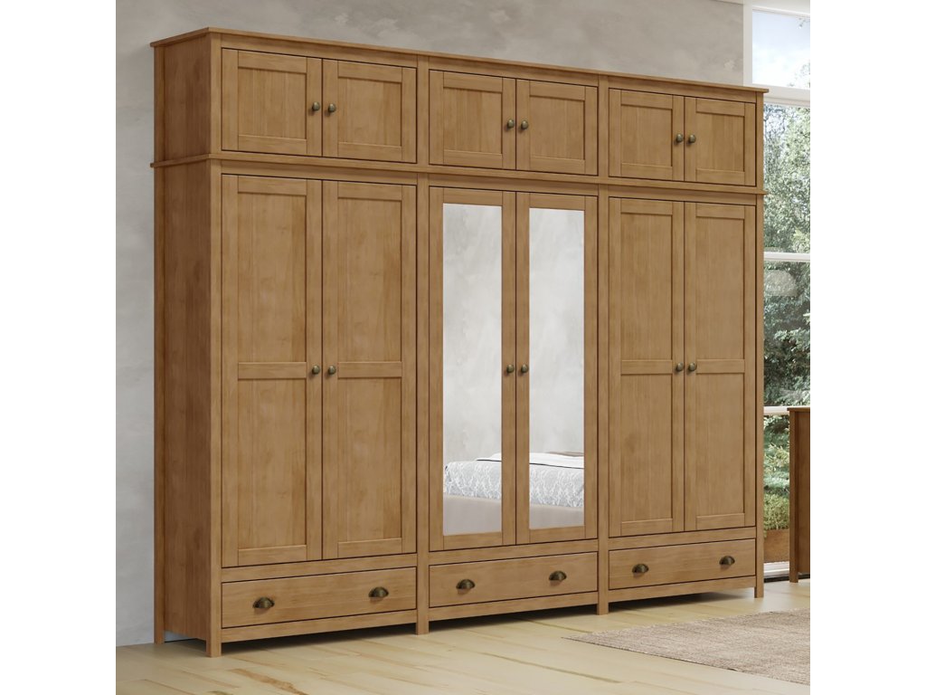 materiál masiv borovice, barevné provedení dub tři zásuvky s kovovými úchytkami a pojezdy v levé a pravé části 1 police a kovová šatní tyč, ve střední části 3 police, na dvou středních dveřích je zrcadlo nástavec je součástí dodávkyDoplňkové parametry