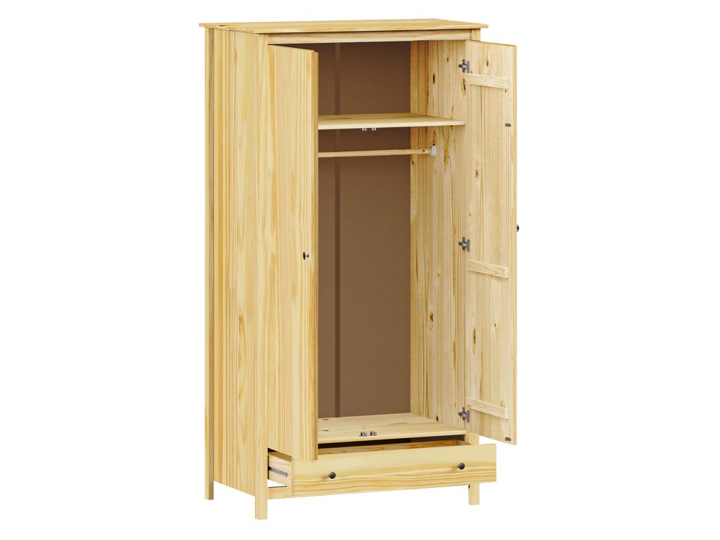Skříň je vybavena šatní tyčí, policí a spodní zásuvkou s kovovými pojezdy, což umožňuje efektivní organizaci prostoru.