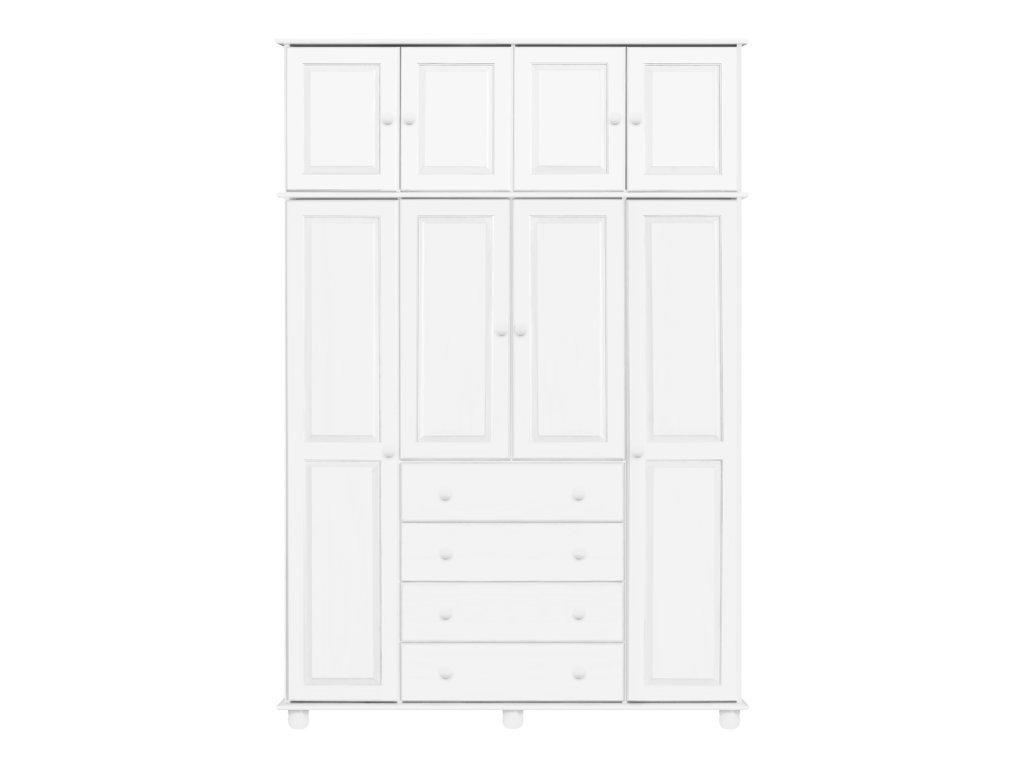 Skříň je vyrobena z masivní borovice s povrchovou úpravou bílým lakem, což zajišťuje pevnost a odolnost nábytku.