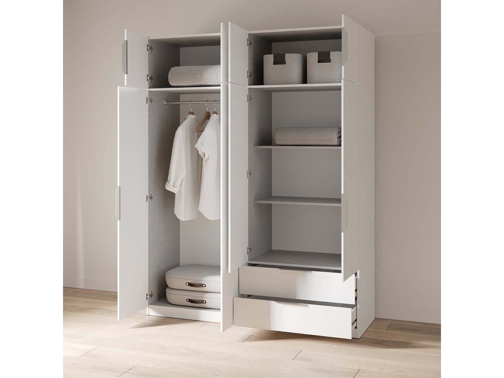 Skříň GHOST od KASTE nabízí rozdělení na poloviny – levá část s šatní tyčí, pravá s policemi a zásuvkami. Ideální pro organizaci oblečení a doplňků.