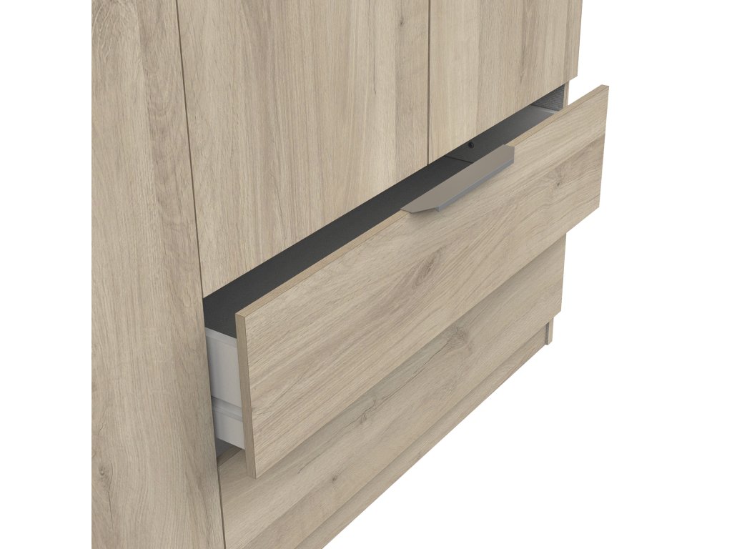 V levé části je šatní tyč na zavěšení oblečení, v pravé části najdete police a zásuvky pro drobnosti. Horní prostory jsou vhodné pro sezonní věci nebo krabice.