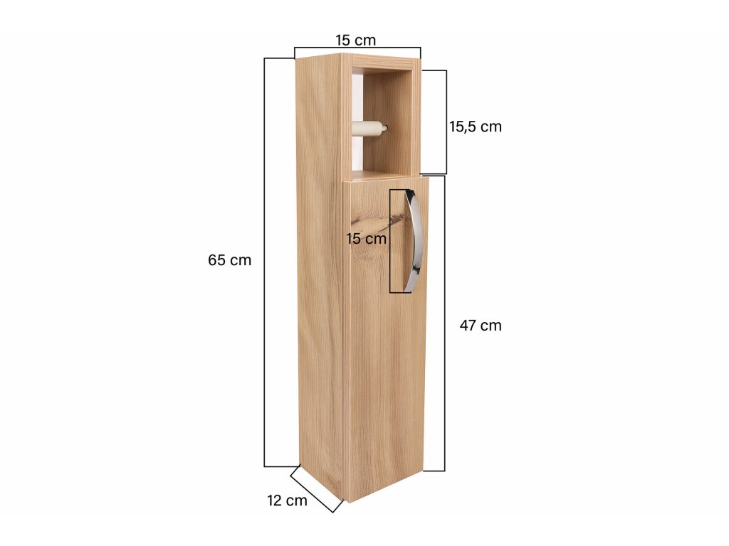 Skříňka má šířku 15 cm, výšku 65 cm a hloubku 12 cm, což ji činí vhodnou pro různé koupelnové prostory.