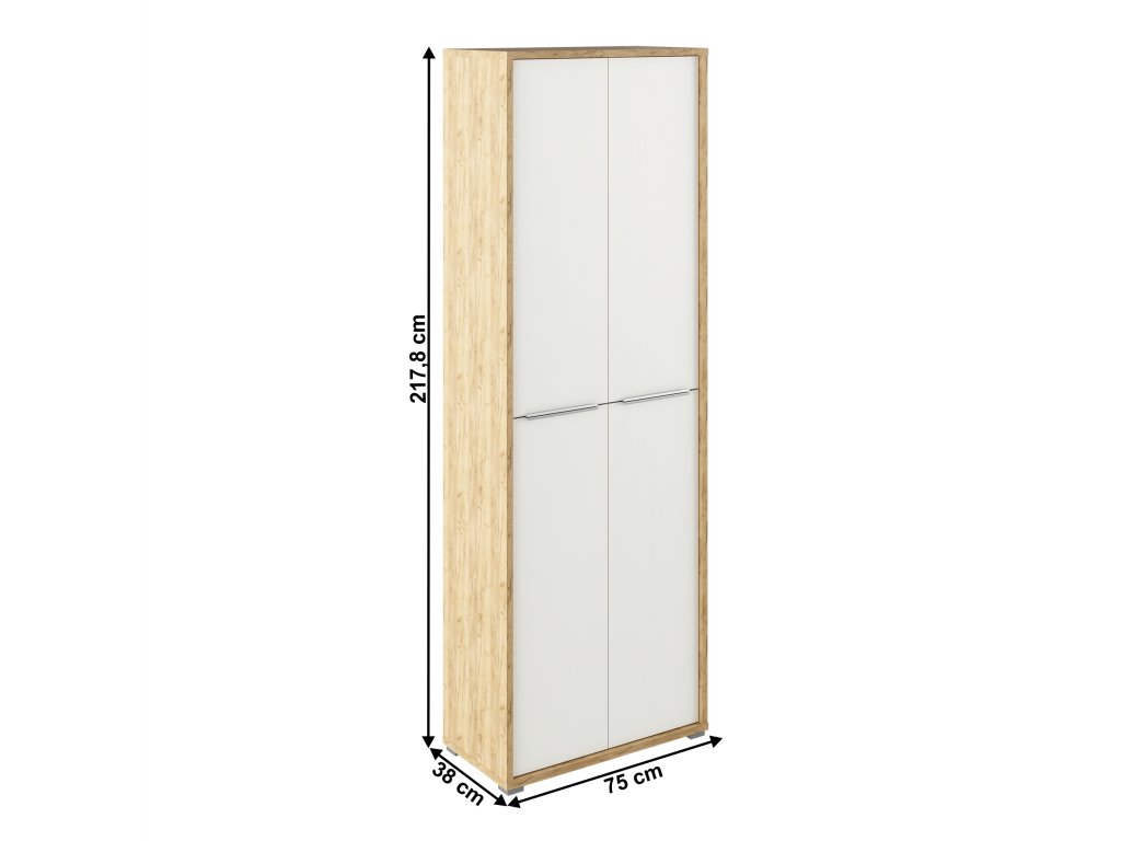Skříň má šířku 75 cm, hloubku 38 cm a výšku 217,8 cm, což poskytuje dostatek úložného prostoru při kompaktním půdorysu.