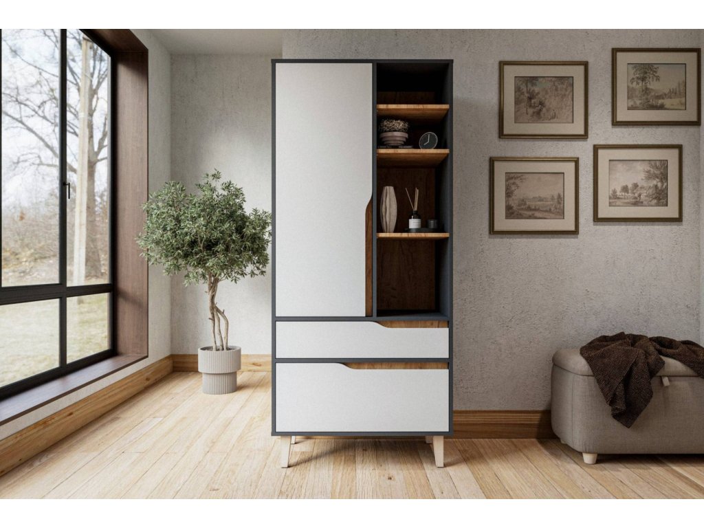 Šatní skříň NO1 nabízí bohatý úložný prostor v podobě dvou zásuvek, otevřeného regálu a polic za dvířky. Je ideální do studentských pokojů, obývacího pokoje nebo ložnice.