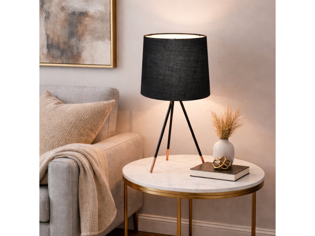 Černý látkový odstín lampy ladí s různými styly nábytku a doplňků. Hodí se do kanceláří, obývacích pokojů i ložnic, kde doplní atmosféru a zvýrazní styl prostoru.