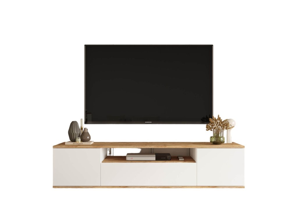 Skříňka má tři dveře s plnými dvířky a prostornou odkládací polici, které umožňují uspořádat elektroniku, ovladače nebo dekorace.