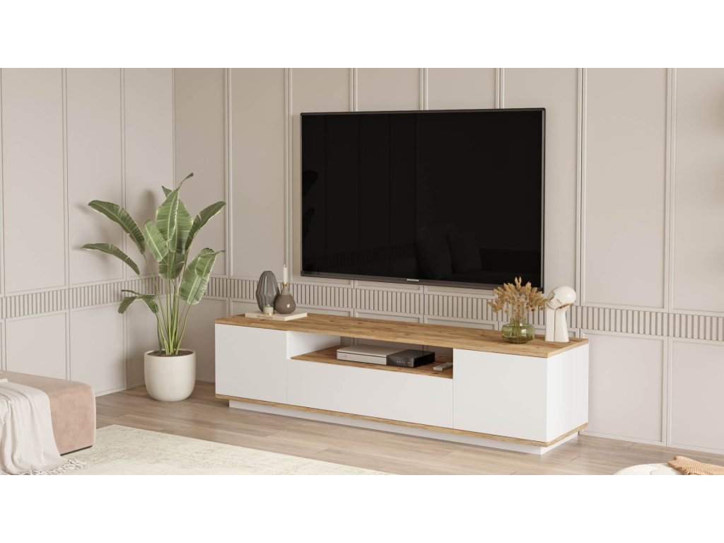 Televizní skříňka NARVA kombinuje moderní vzhled s praktickým uspořádáním. Ideální pro umístění televize a doplňků, nabízí dostatek úložného prostoru.