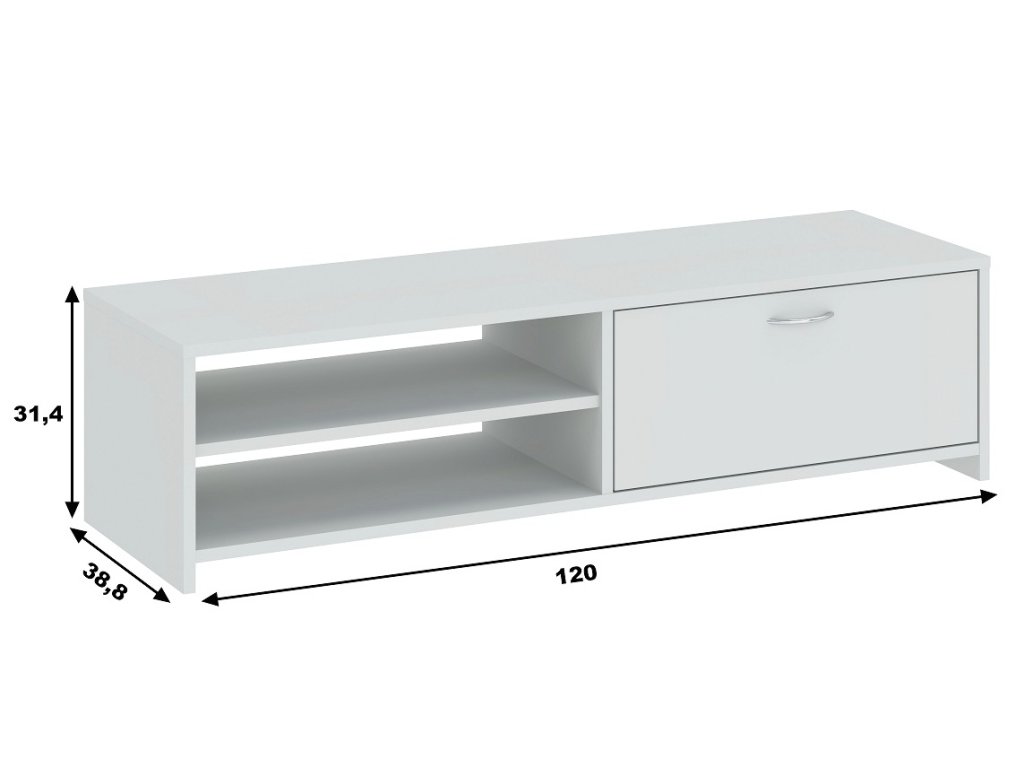 Stolek má šířku 120 cm, hloubku 39 cm a výšku 31 cm, což je vhodné pro většinu televizorů.