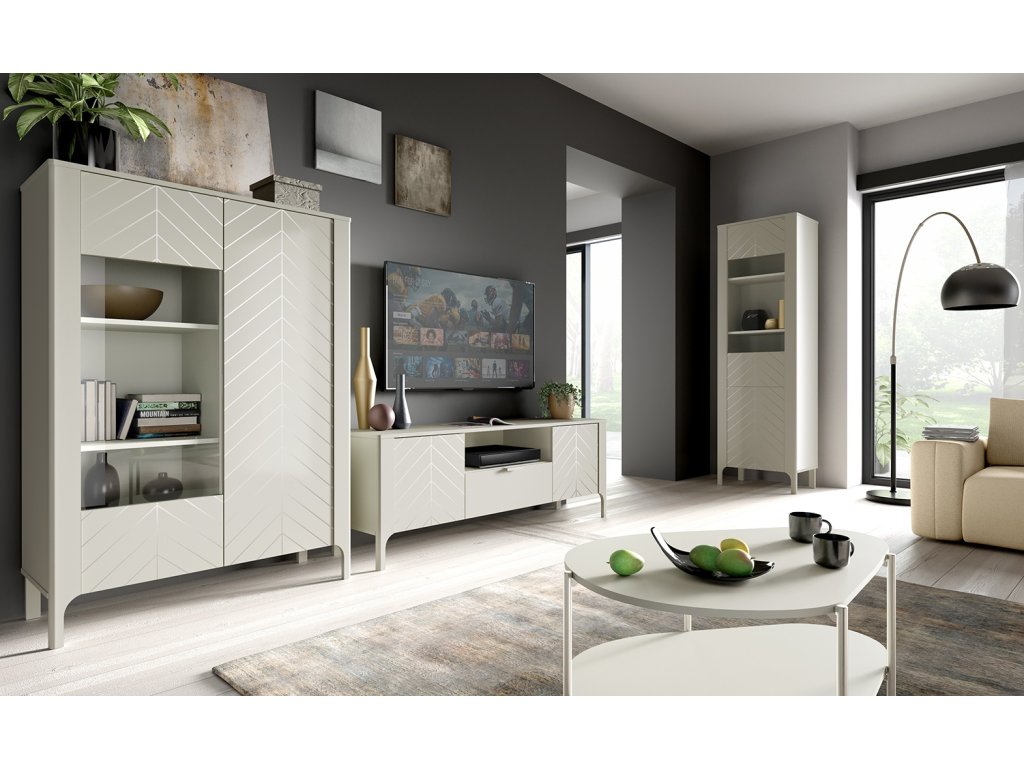 Vzor rybí kosti na čelních plochách a kovové úchyty dodávají nábytku charakter. Barva kašmír působí jemně a nadčasově.