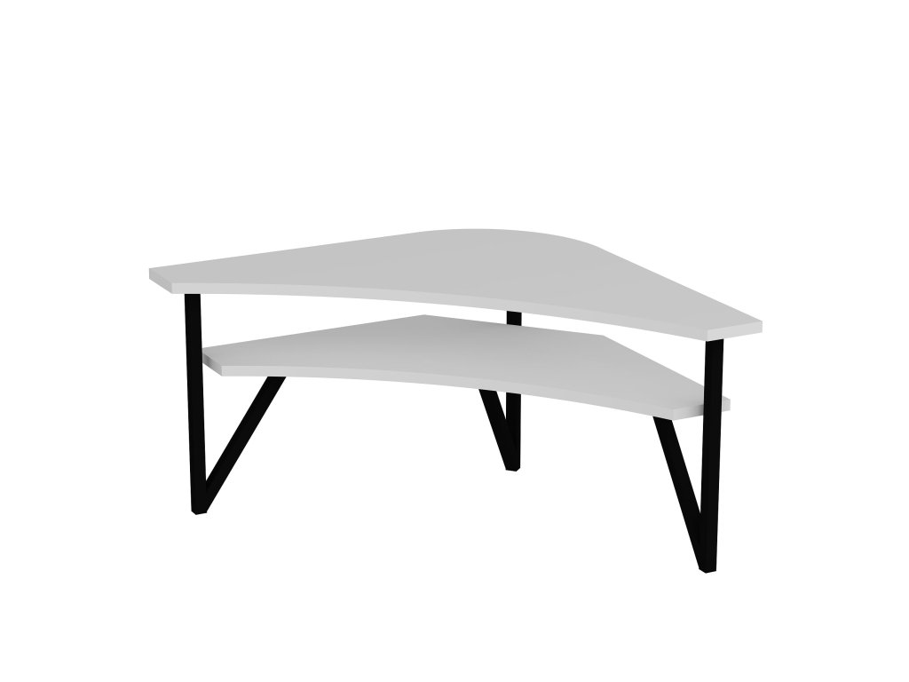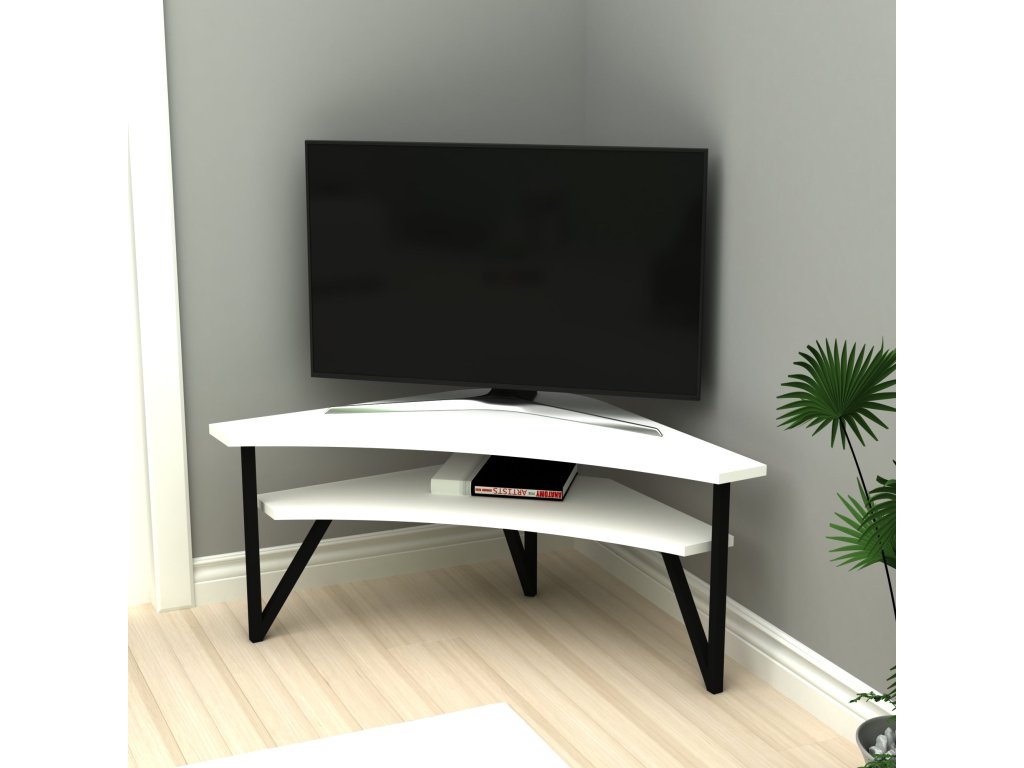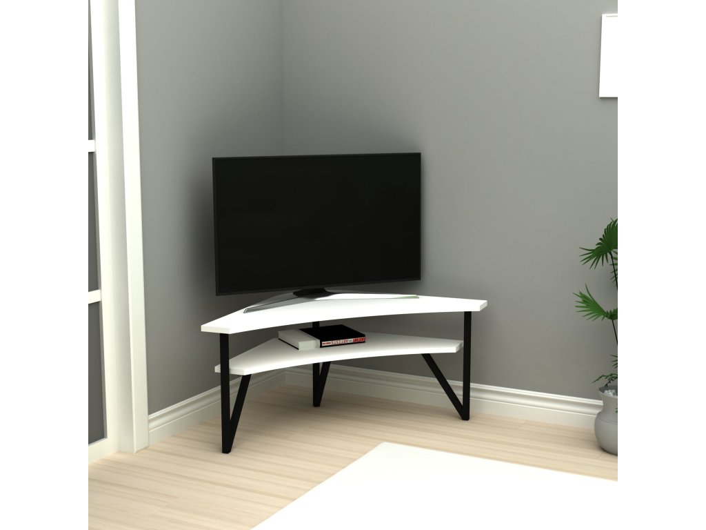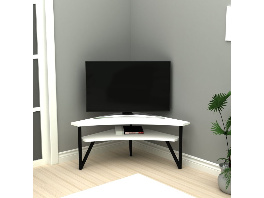 TV stolek Trikala s policí v bílé barvě nabízí praktické úložné prostory a moderní industriální design. Ideální pro uspořádání elektroniky, dekorací či médií.
