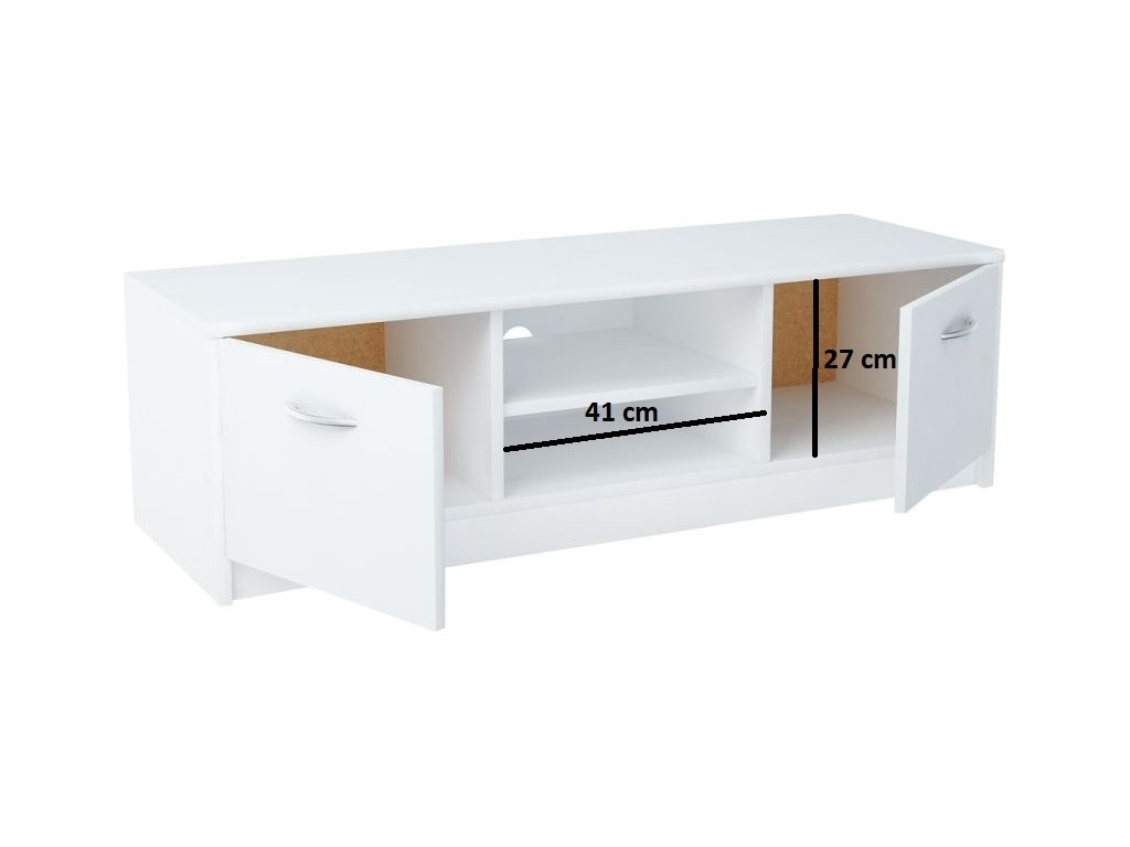 Dvoudveřový TV stolek v moderním provedení. Korpus i dvířka jsou z kvalitní LTD v barvě matná bílá. Lamino je odolné vůči vysokým teplotám, poškrábání a nárazům, hraněné ABS páskou. Jasně viditelná struktura dřeva. Dodáváme v demontovaném stavu.Doplňkové parametry