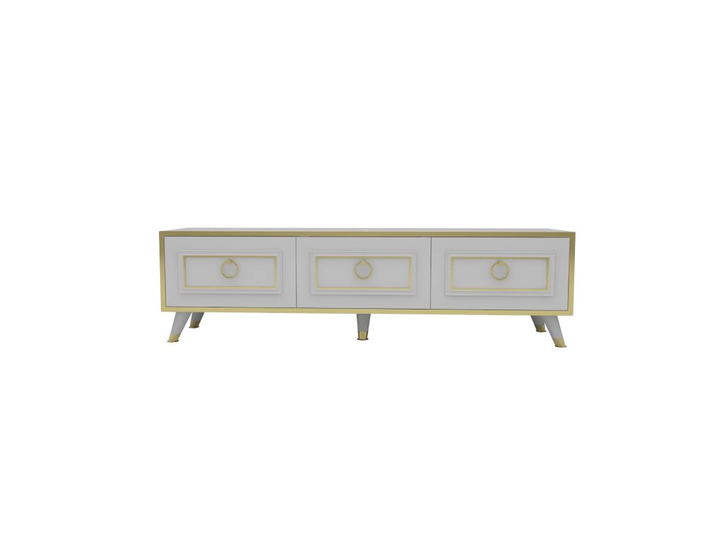 Vyroben z LTD lamina v bílé a zlaté barvě, s rozměry 44.6 x 150 x 29.6 cm. Plná dvířka a 3 zásuvky poskytují dostatek prostoru pro elektroniku a dekorace.