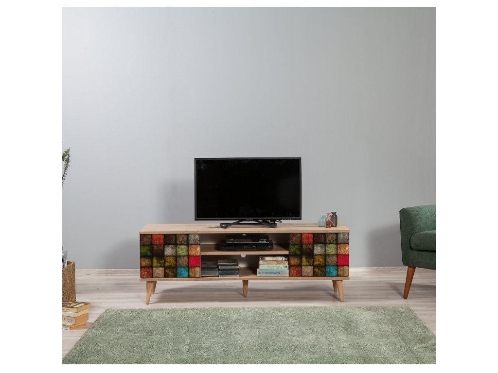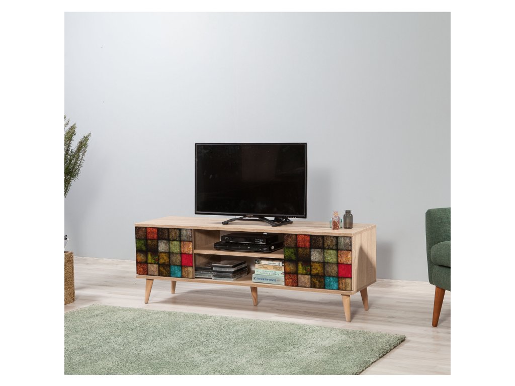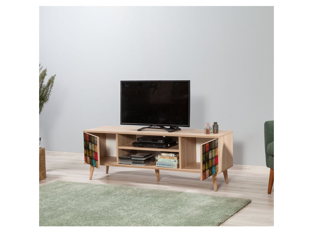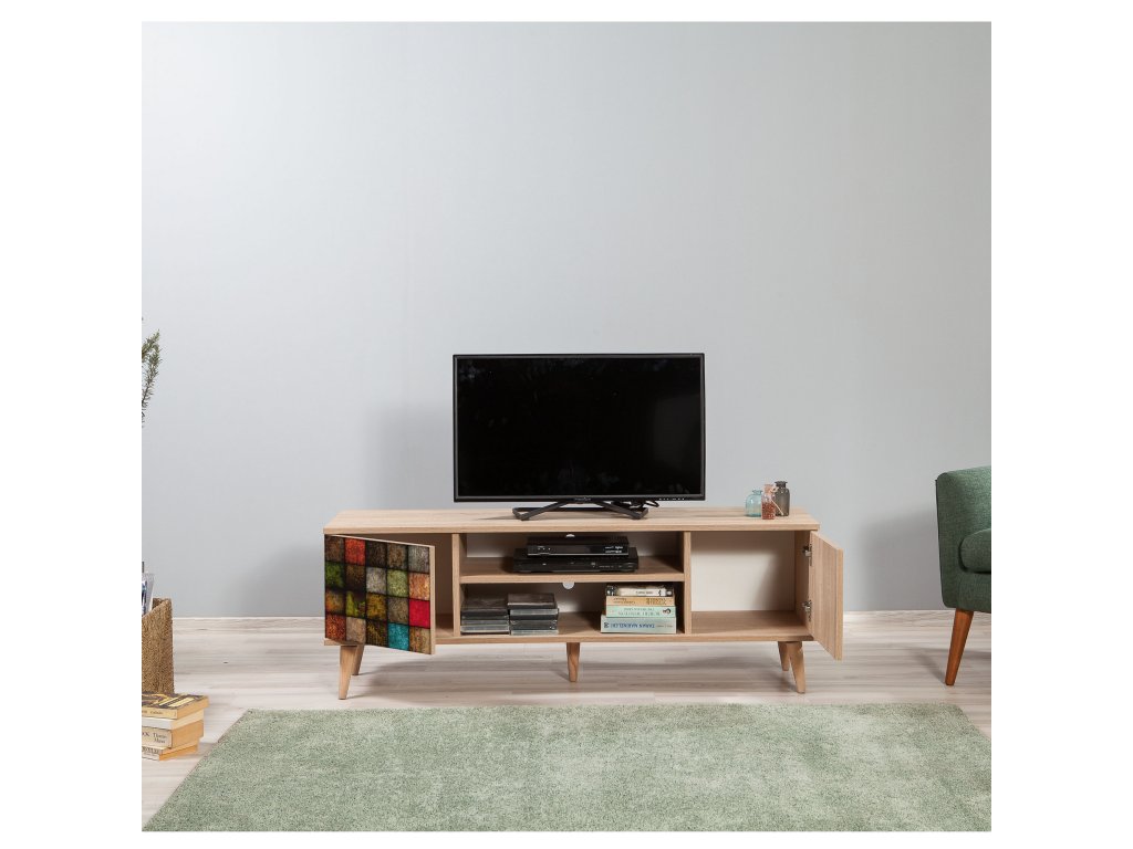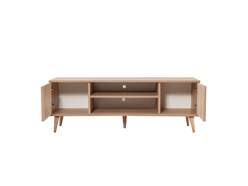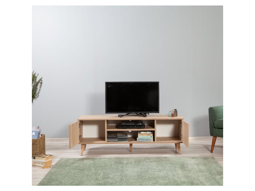Stolek je navržen tak, aby nabídl praktický úložný prostor. Dvě plná dvířka skryjí vše, co nechcete mít na očích, zatímco regálek poskytuje místo pro dekorace, knihy nebo multimediální zařízení. Jeho rozměry zajišťují dostatek prostoru pro televizor i další příslušenství.
