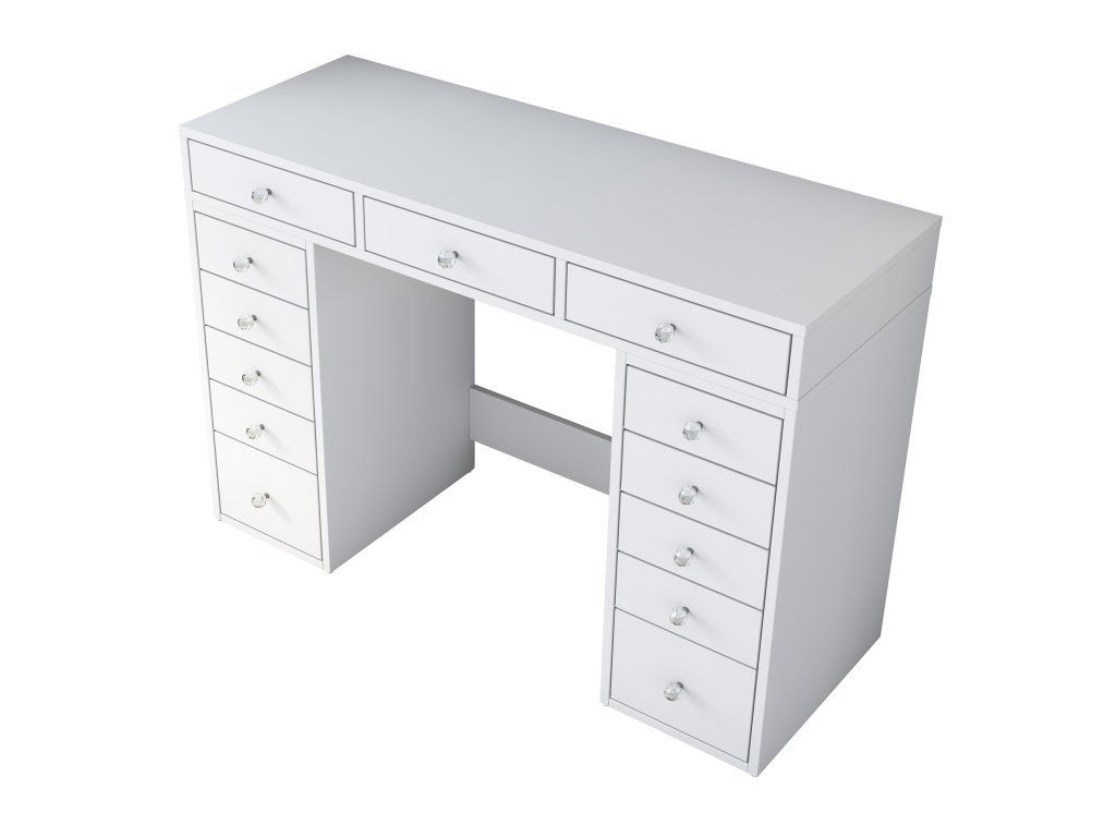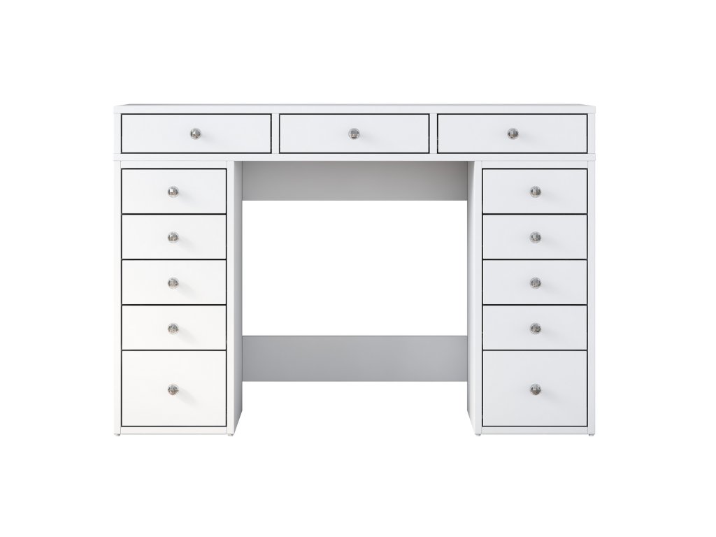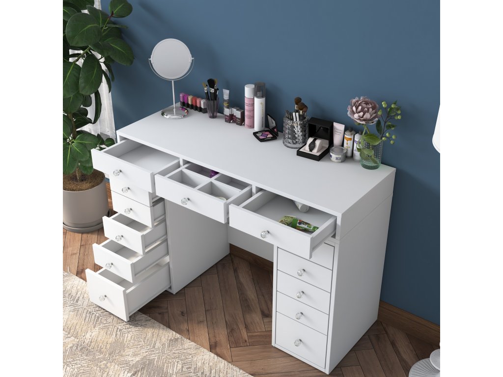 Toaletní stolek MALNATE v bílé barvě nabízí 13 zásuvek pro přehledné uskladnění kosmetiky, šperků a dalších drobností. Ideální pro organizaci a snadný přístup k vašim potřebám.