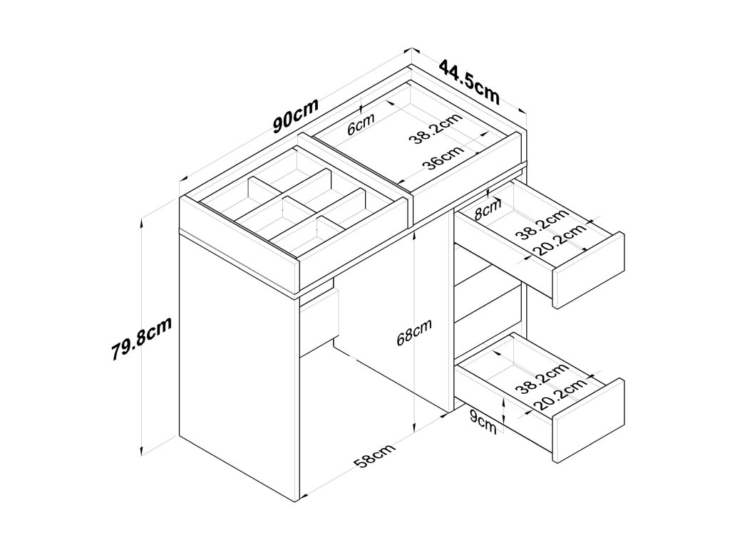 Rozměry toaletního stolku jsou přizpůsobené pro pohodlné používání v ložnici, s dostatkem prostoru pro uspořádání kosmetiky a doplňků.