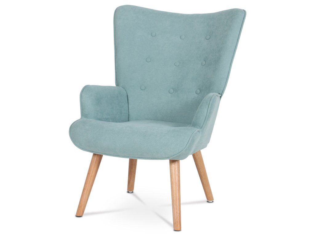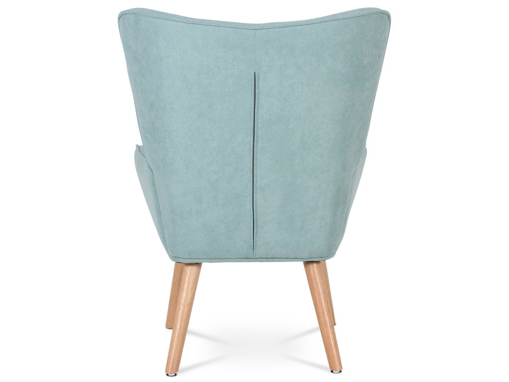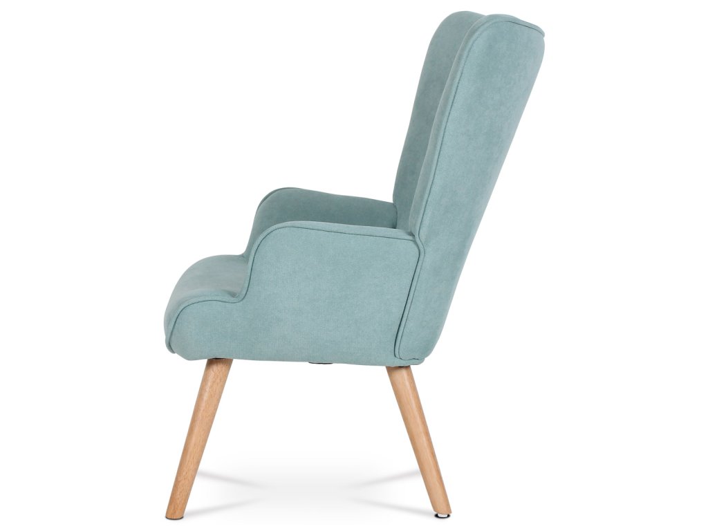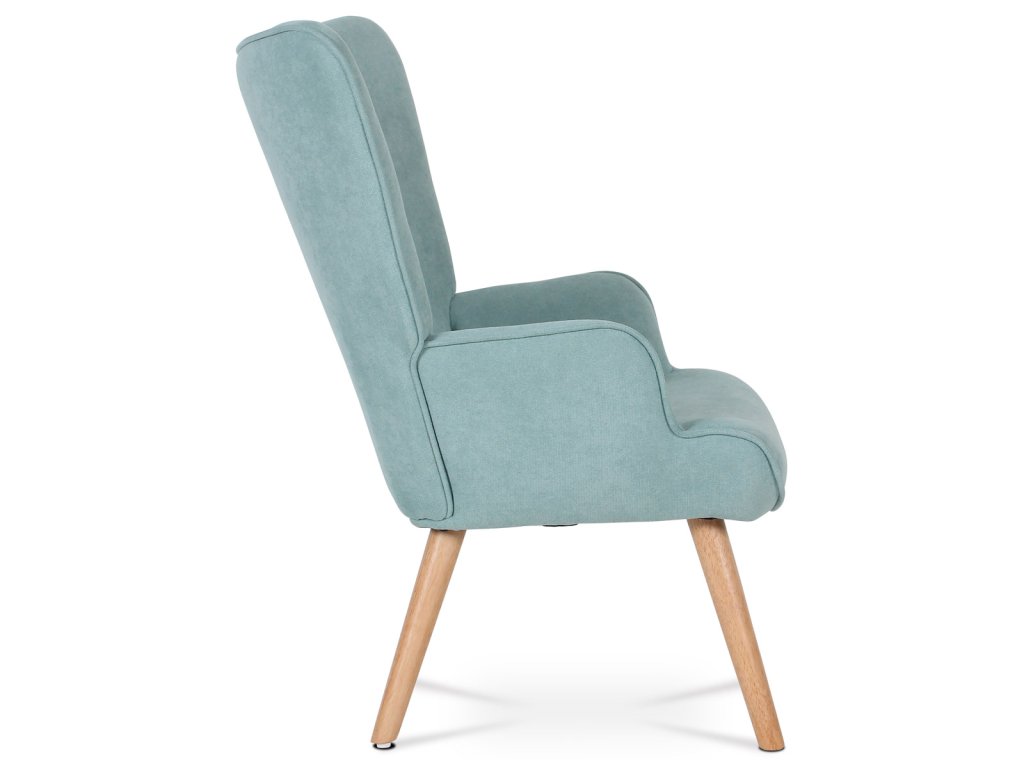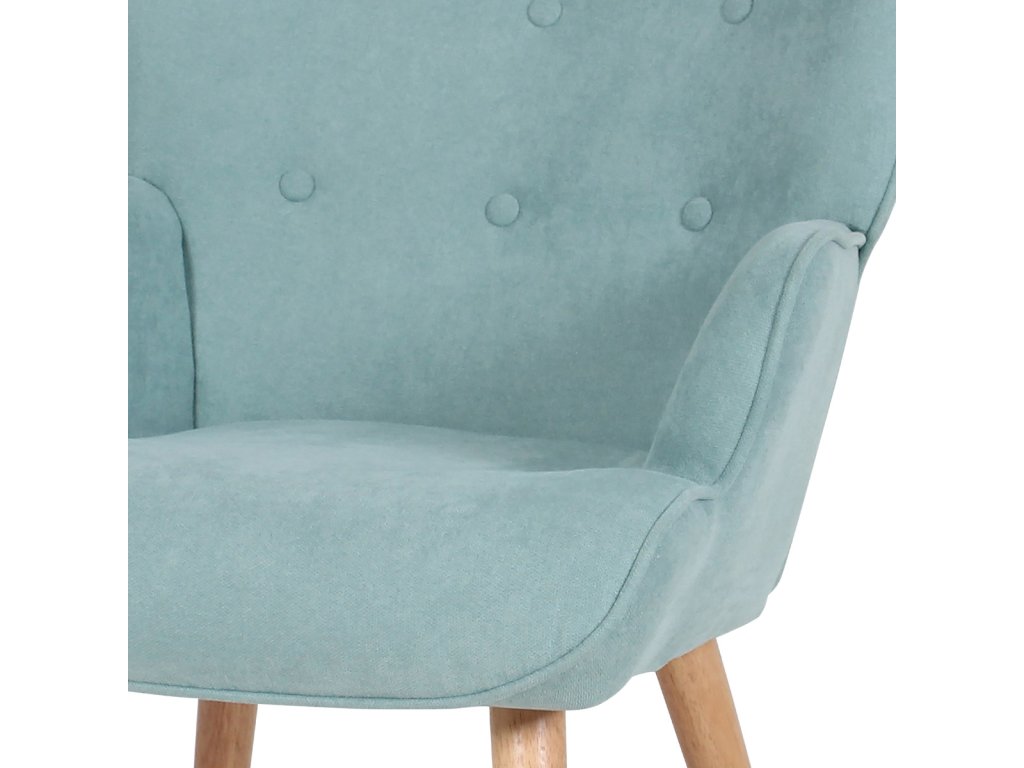 Minimalistické linie a světle modrý potah z látky doplňují přírodní nohy z masivního kaučukovníku. Křeslo se hodí do moderních i retro interiérů.