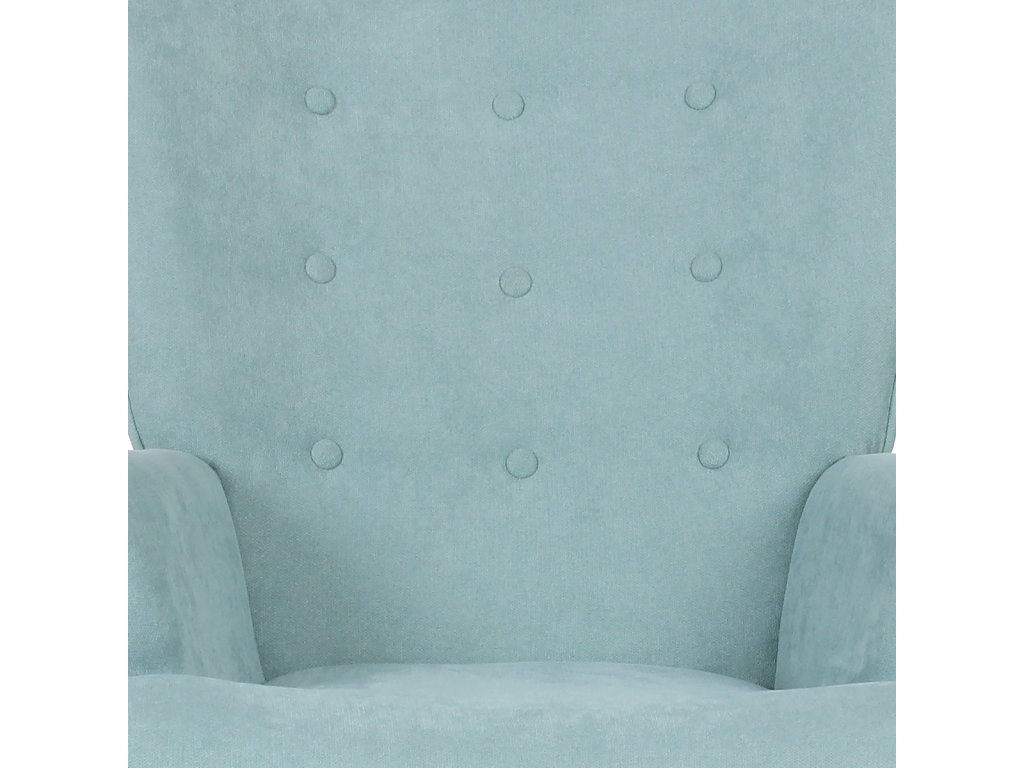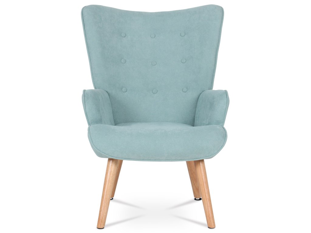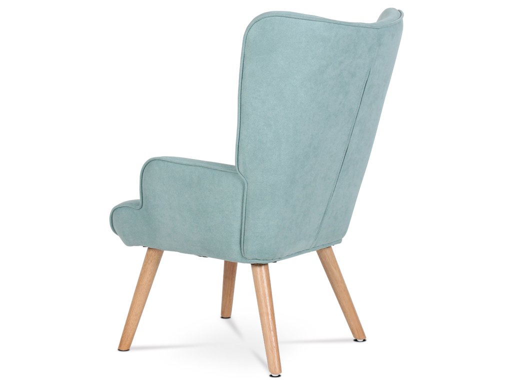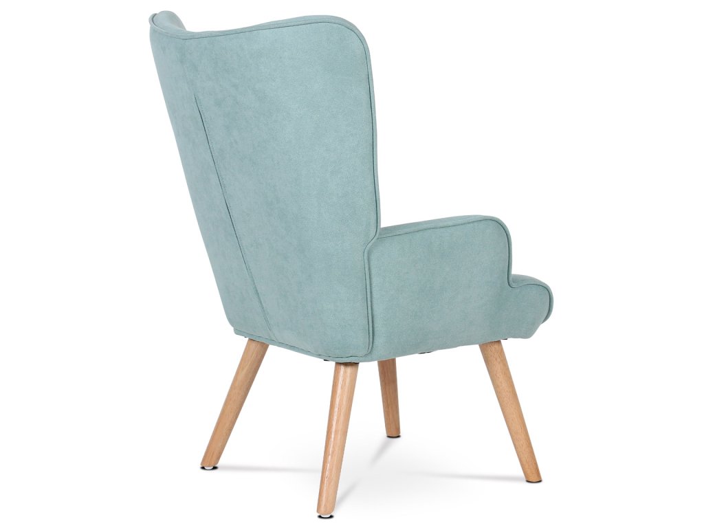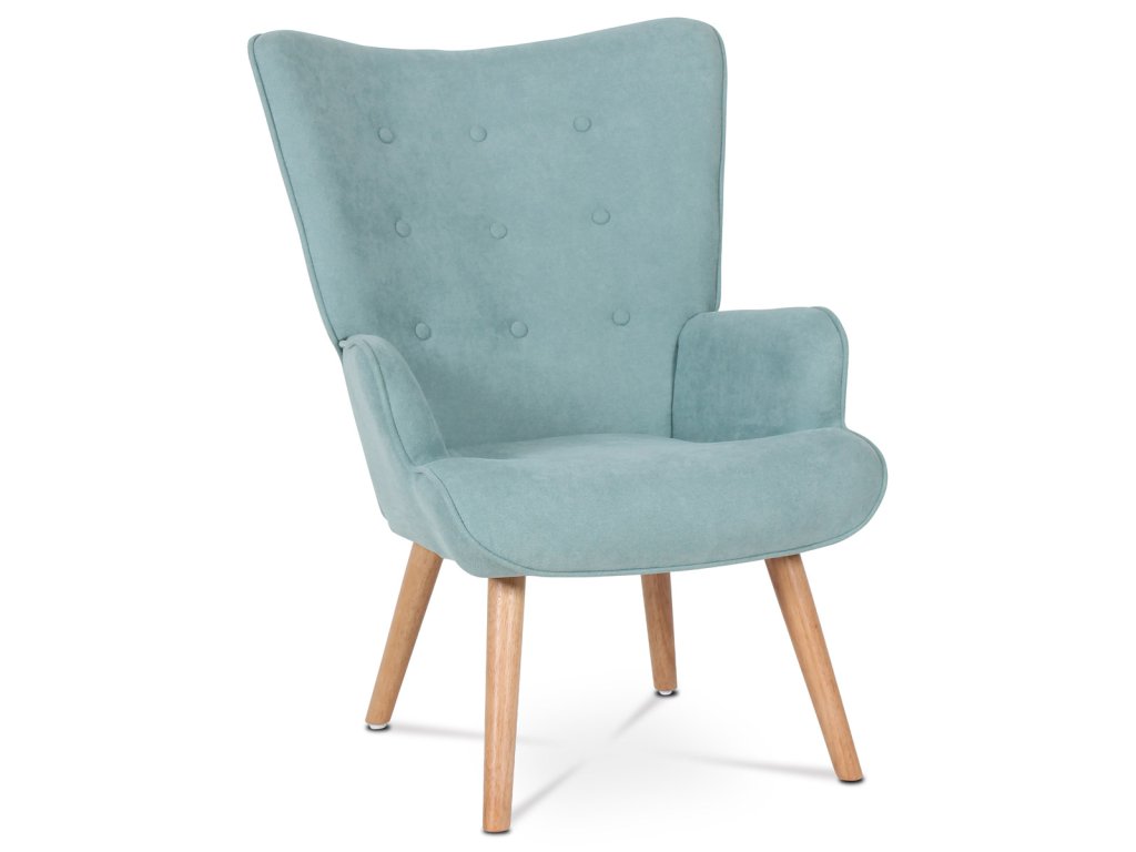 Minimalistické linie a světle modrý potah z látky doplňují přírodní nohy z masivního kaučukovníku. Křeslo se hodí do moderních i retro interiérů.