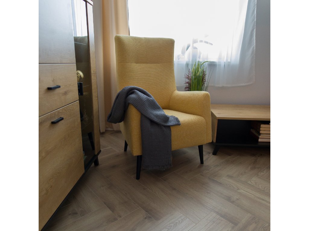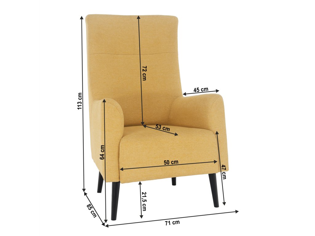 Křeslo ušák SAMY v žluto-černém provedení nabízí pohodlné sezení díky vysokému opěradlu a širokému sedáku. Je celočalouněné kvalitní látkou Matana s vysokou odolností proti oděru.
