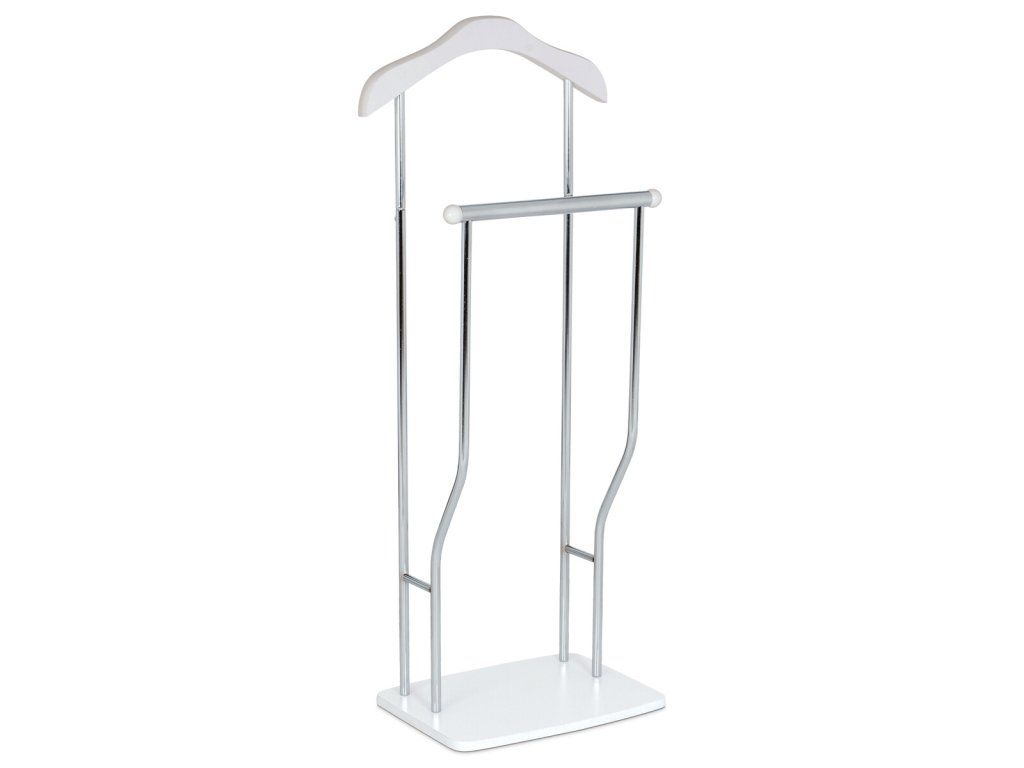 Němý sluha v bílé matné úpravě z MDF a chromovaného kovu nabízí stabilní místo pro odložení oblečení a doplňků. Výška umožňuje zavěšení bez pomačkání.