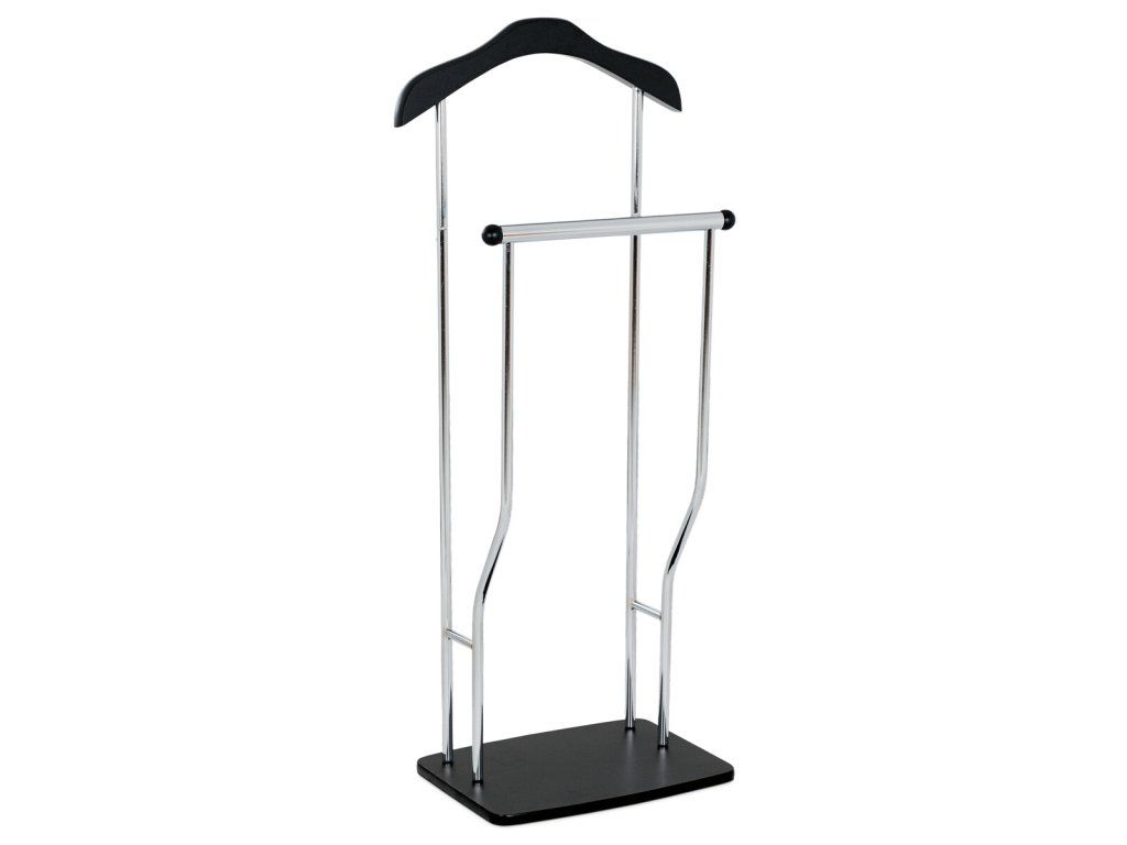 Němý sluha kombinuje černý matný lak MDF s chromovaným kovem. Je vhodný pro zavěšení oblečení a doplňků bez pomačkání díky výšce 108 cm.