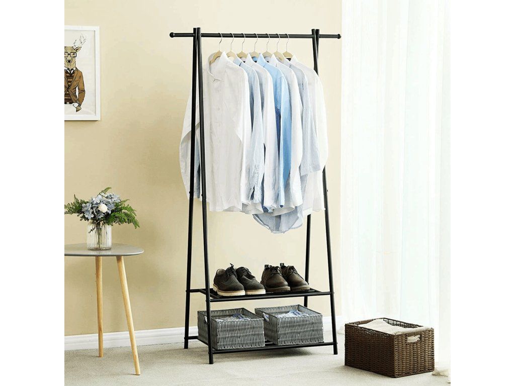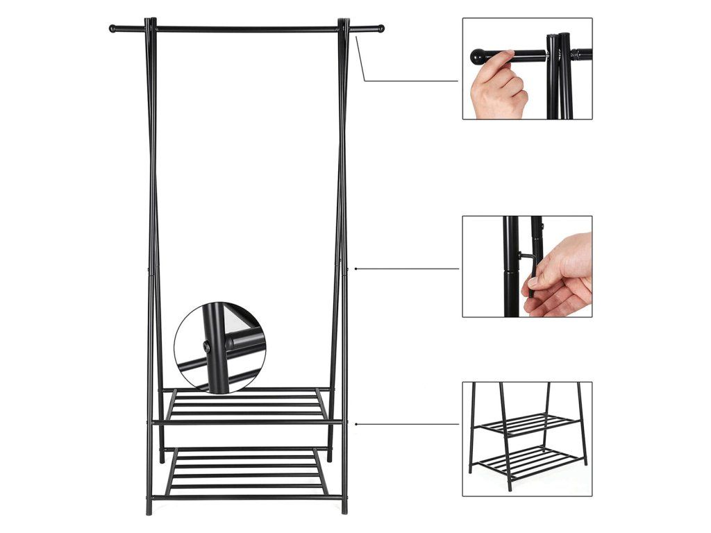 Vyroben z práškovaného kovu, věšák je odolný a snadno se udržuje. Disponuje horní tyčí na zavěšení oblečení a dvěma policemi s roštovou konstrukcí na boty či doplňky.