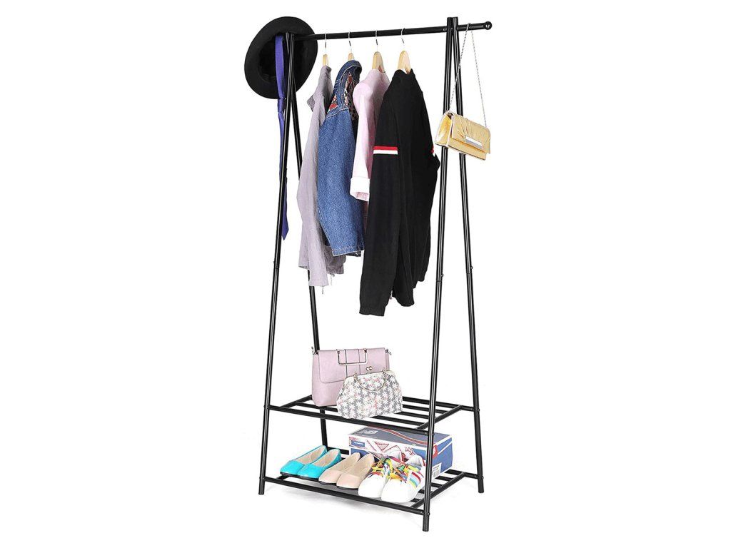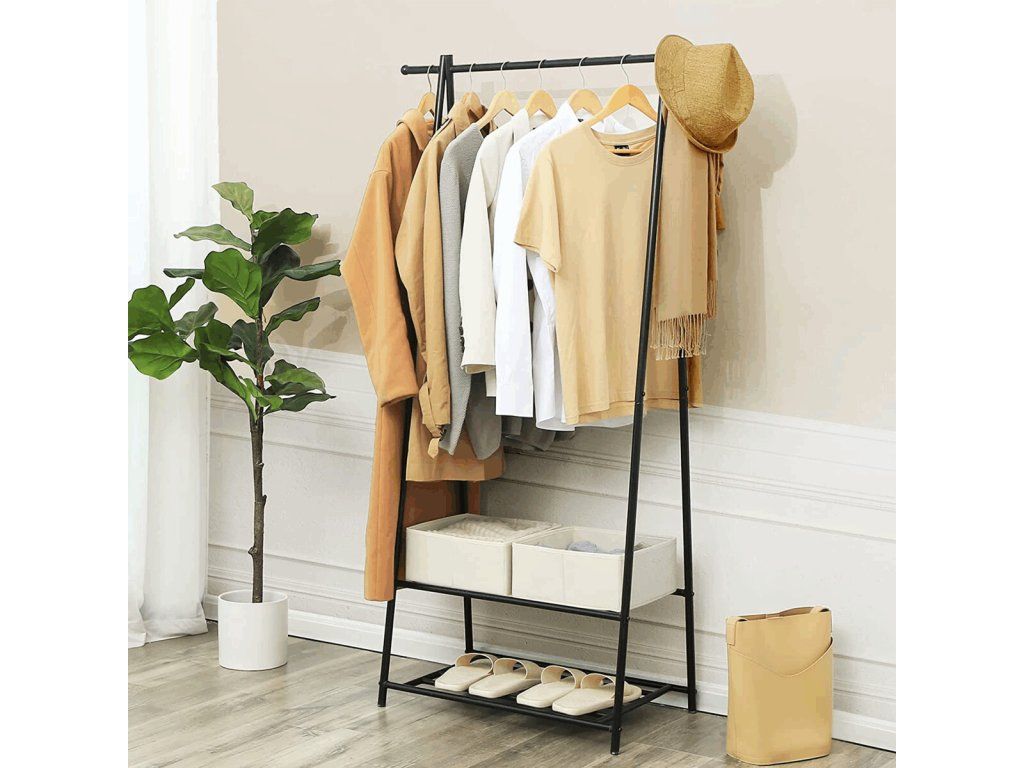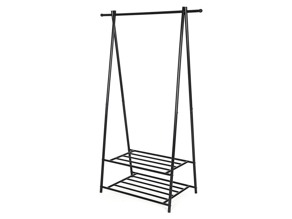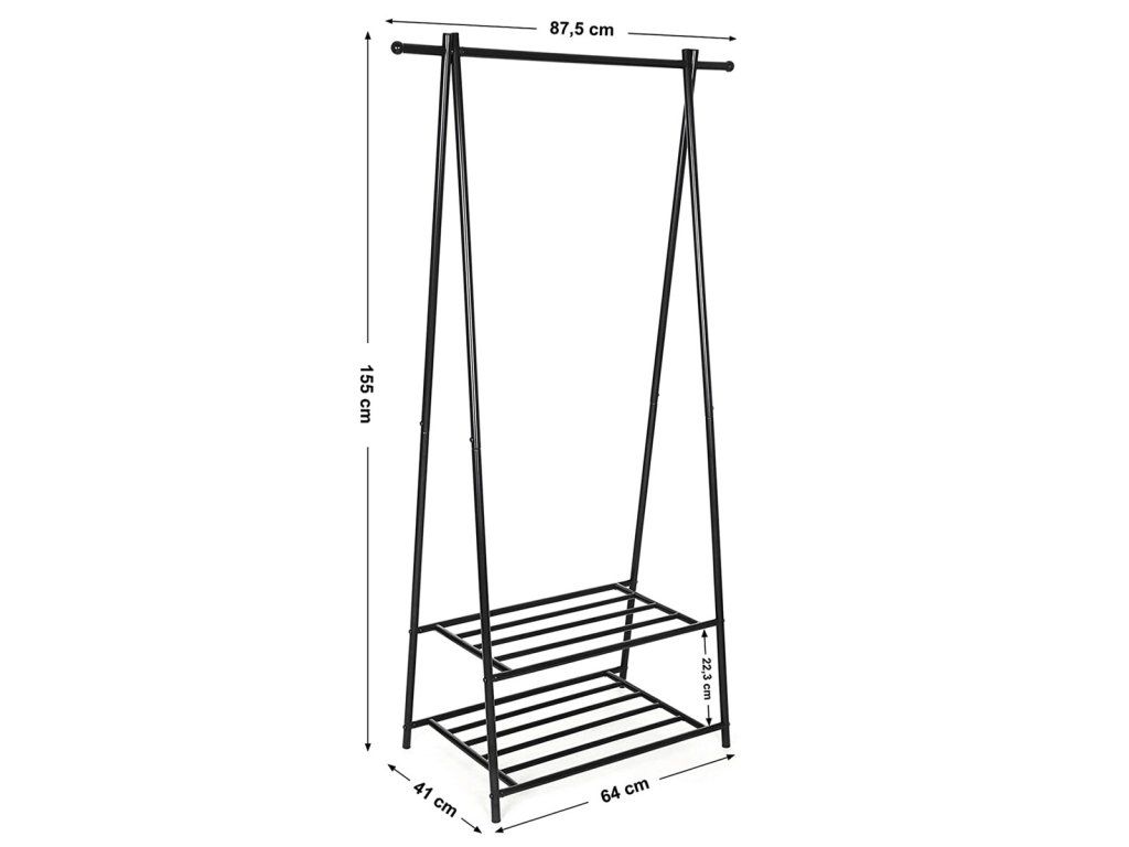 Kovový věšák na šaty v černém provedení nabízí praktické řešení pro uspořádání oděvů i obuvi. Robustní rám je tvořený práškově lakovanými trubkami, které zajišťují stabilitu a dlouhou životnost. Věšák je vybaven horní tyčí pro zavěšení oblečení a dvěma policemi s roštovou konstrukcí, které umožňují odkládání bot nebo dalších doplňků. Díky jednoduchému designu a kompaktním rozměrům se hodí do předsíní, ložnic i šaten, kde pomáhá udržet pořádek a přehlednost. Celková nosnost odpovídá pevnosti materiálu a konstrukce umožňuje snadnou montáž i údržbu.