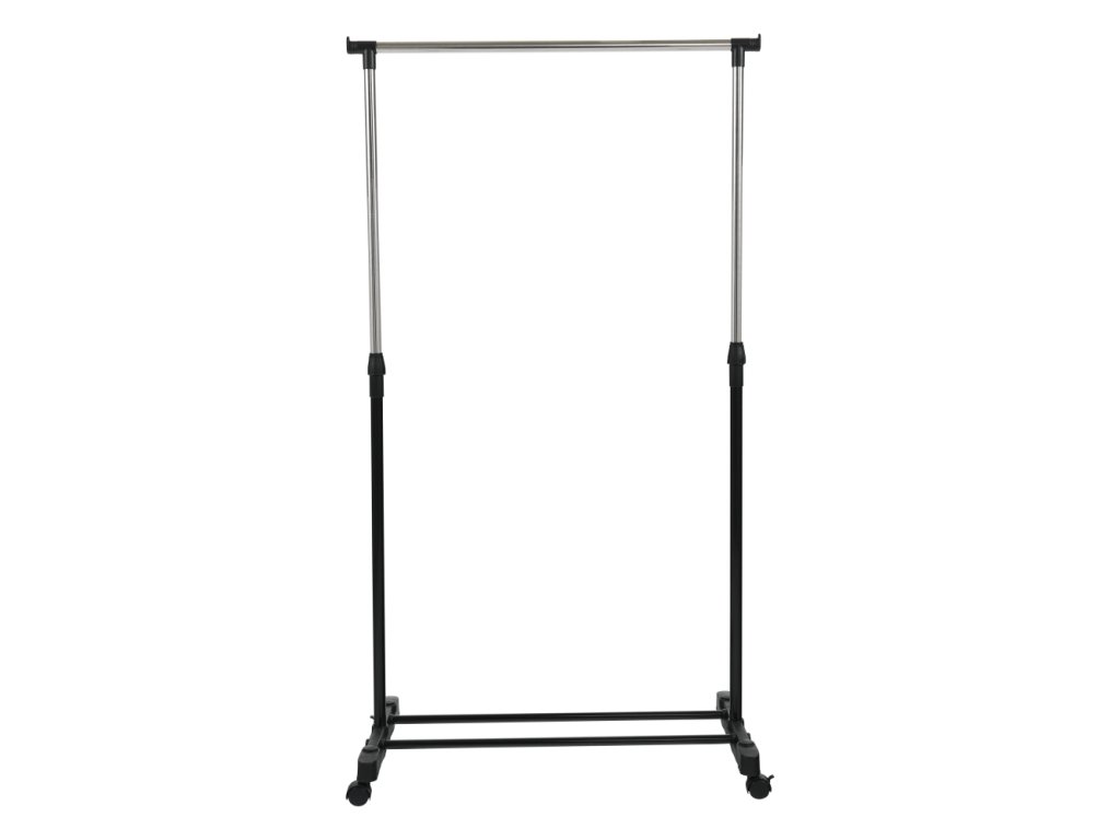 Praktický věšák na kolečkách s nastavitelnou výškou tyče pro snadné zavěšení oděvů. Kombinace nerezového kovu a černého plastu zajišťuje odolnost a moderní vzhled.