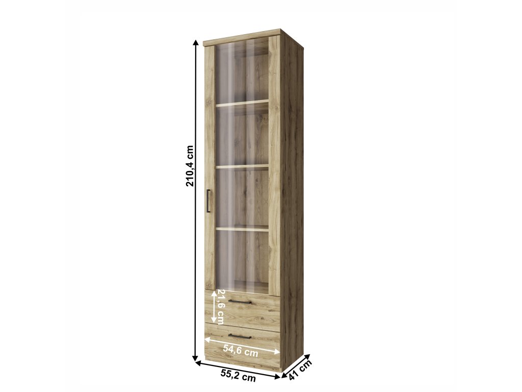 Vitrína má rozměry 55,2 cm na šířku, 41 cm hloubku a výšku 210,4 cm, což ji činí vhodnou do různých interiérů.
