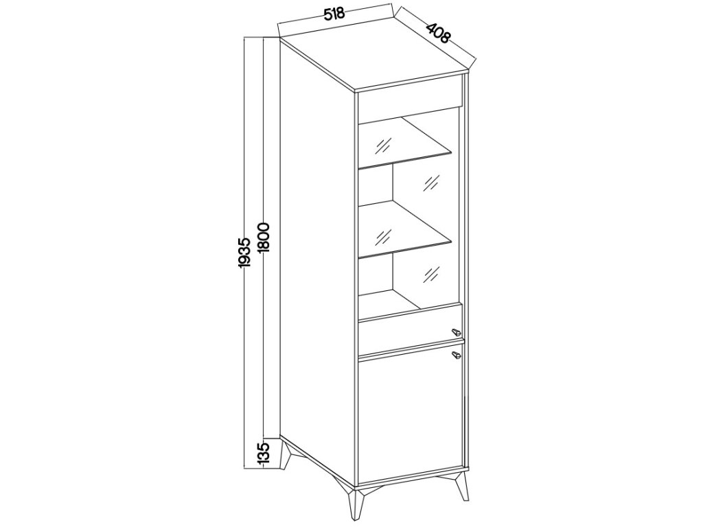 Vitrína má výšku 193,5 cm, šířku 51,8 cm a hloubku 40,8 cm, což ji činí vhodnou pro různé prostory.