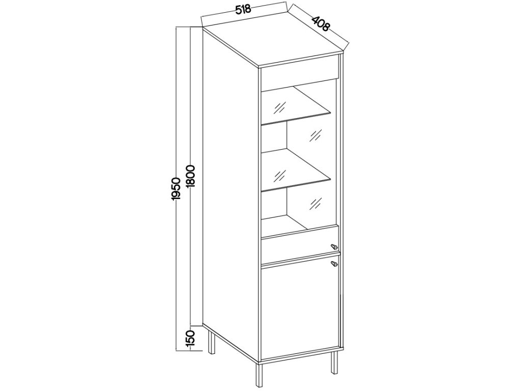 Vitrína má výšku 195 cm, šířku 51,8 cm a hloubku 40,8 cm, což ji činí vhodnou i do menších prostor.