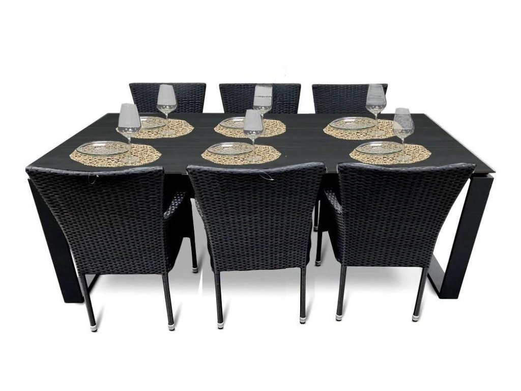 Zahradní sestava (stůl + 6 židlí) - stůl s odolnou Artwoodovou deskou a hliníkovou konstrukcí (š/ v/h): 210 X 74 X 100 cm. Židle - Rozměry (v/š/h): 87 x 67 x 52 cm. Výška sedu 42 cm, šířka sedu 46 cm. Díky použitým materiálům není údržba nejen stolu nijak náročná, stůl je lehký a tím pádem se snadno přenáší. Barevné provedení - černá.